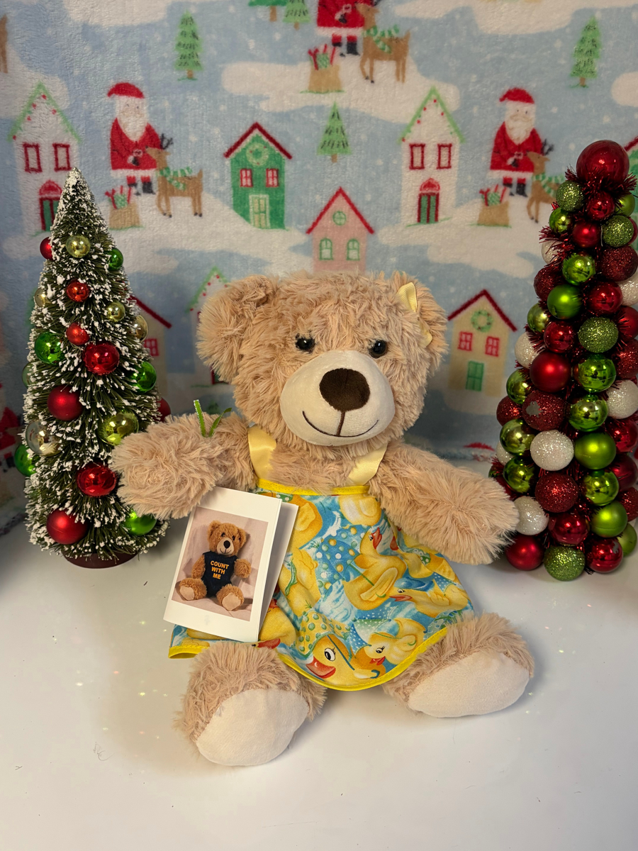 Rubber Ducky Raina is a joyfully handcrafted bear dressed in a bright, cheerful apron-style dress splashed with playful yellow ducks and bubbly blue water. With her soft tan fur, sweet smile, and sunny yellow hair bow, Raina brings lighthearted fun, warmth, and bath-time giggles into every moment. She proudly carries her How to Count book, excited to help her new friend learn numbers with curiosity, confidence, and plenty of cheerful energy. Whether she’s joining pretend splashy adventures, sitting brightly beneath the Christmas tree, or offering cozy cuddles after a long day, Rubber Ducky Raina fills every home with joy, comfort, and love. Handmade with care, bubbling with personality — Raina is ready to meet her forever friend.