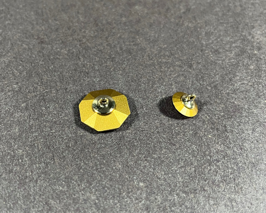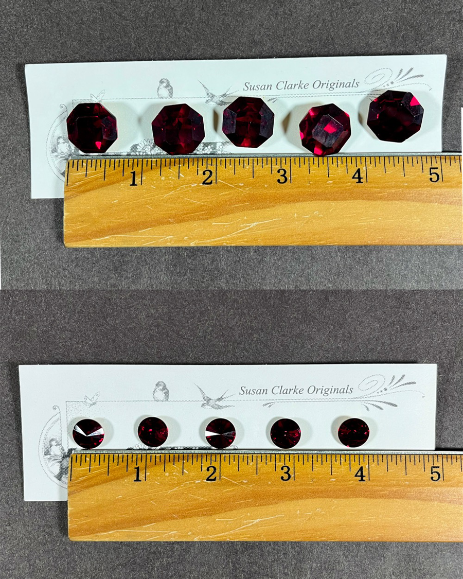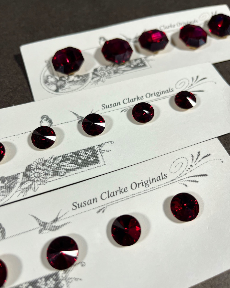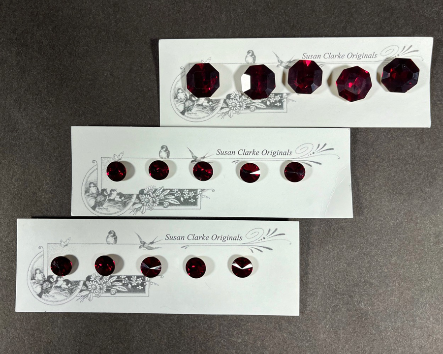Replica ruby buttons from Susan Clark Originals. 10 round at 3/8" diameter and 5 octagonal at 5/8" diameter.