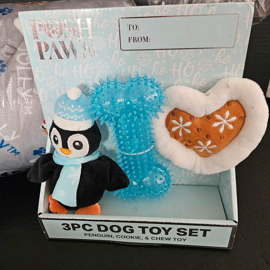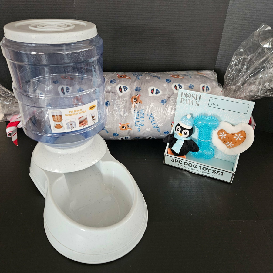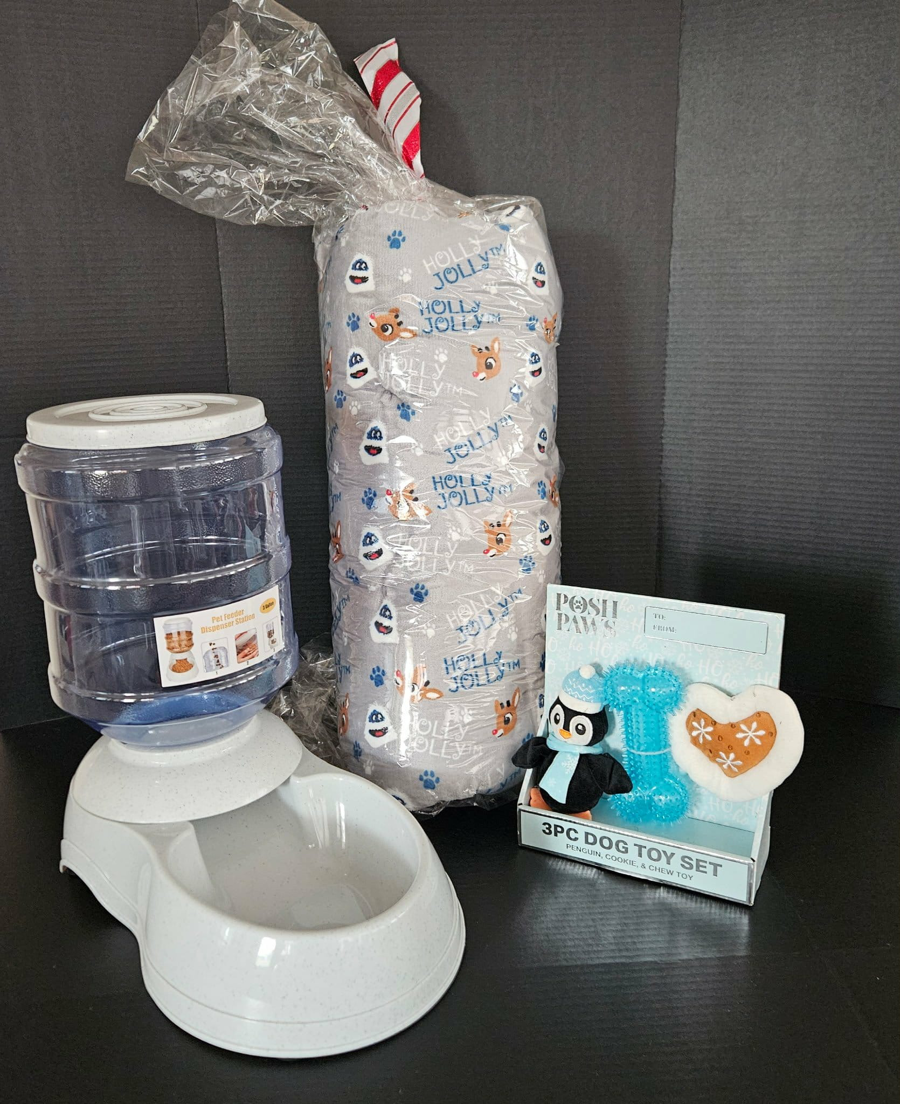 This delightful pillow bed is not only incredibly comfy but also features an adorable design of Rudolph, making it a charming addition to your pet's space. We are including a convenient 3-gallon pet feeder dispenser for your dog, so he will always have some kibble waiting for him. The package also comes with a Posh Paw dog toy set, which includes three engaging toys to keep your beloved pet happy and busy. Pamper your pet with comfort and fun!