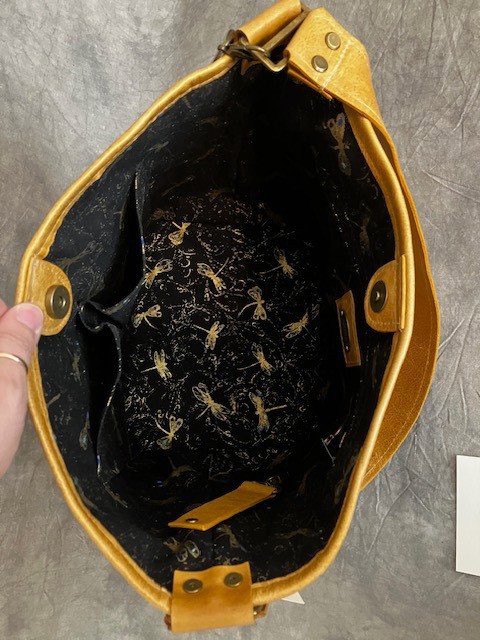 Custom, Hand-Crafted Leather Handbag. Spacious Butterfly Bucket bag made of top-grain leather with brass-toned hardware accents; magnet closure; beautiful dragonfly print interior lining with one zippered pocket, two interior divisions for additional storage; a keychain holder; one large exterior pocket and 26" Shoulder Strap.