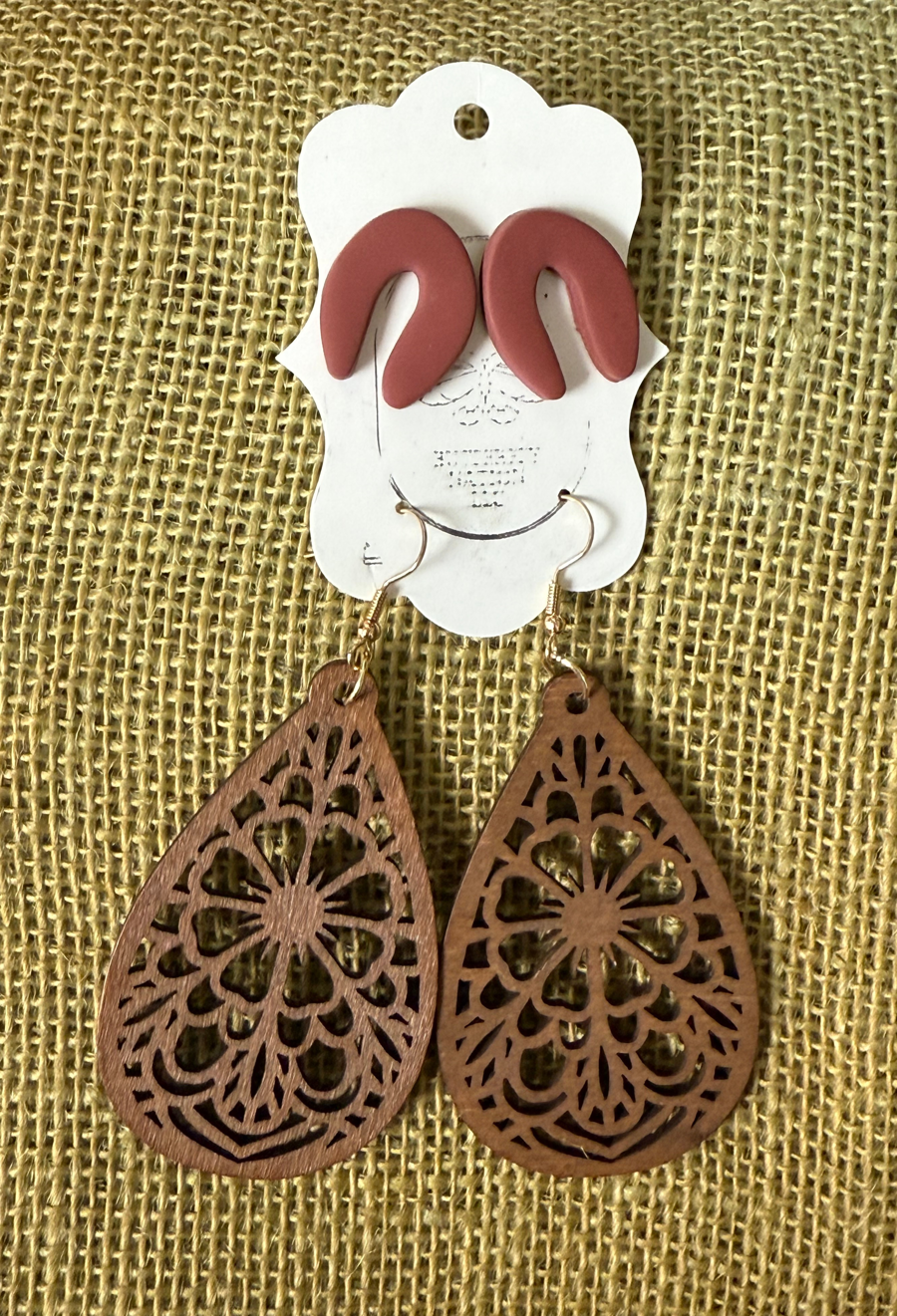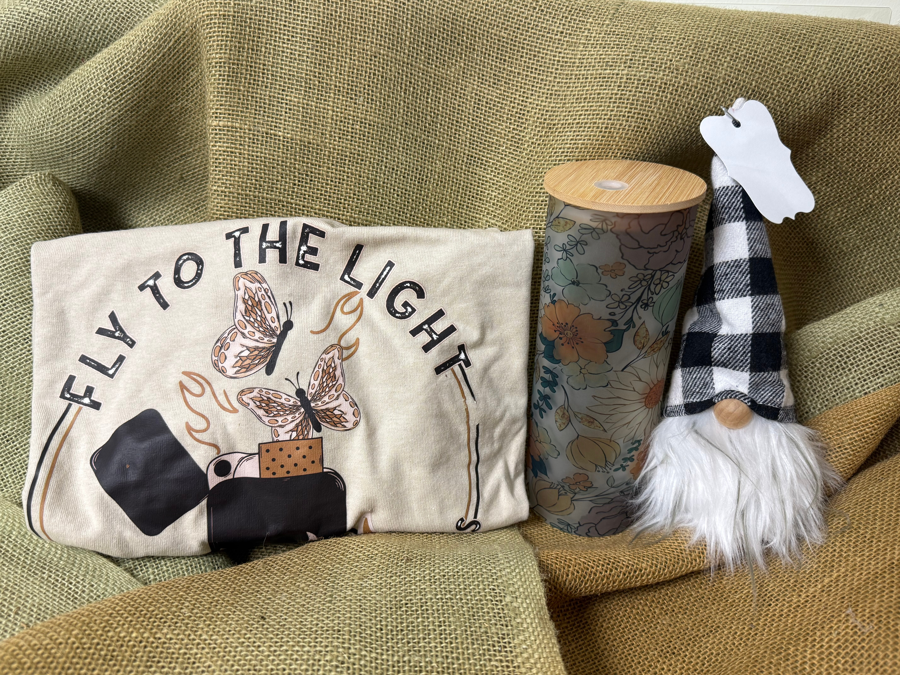 Bring a touch of handcrafted charm to your day with this beautifully curated set featuring: 2XL Graphic T-Shirt – Design with butterflies and lighter graphic Pair of Earrings – Lightweight teardrop filigree-style wooden earrings Freehanded burned Hat – Deep burgundy hat with decorative stitching and artisan detailing Hanging Gnome – Adorable handmade gnome ready to hang, featuring a black-and-white check hat and soft white beard Decorative Cutting Board – Wood board with floral accents Floral Travel Mug – Reusable mug with lid and soft vintage-style flower pattern Perfect for anyone who loves artisan craftsmanship, cozy rustic style, and one of a kind handmade pieces!