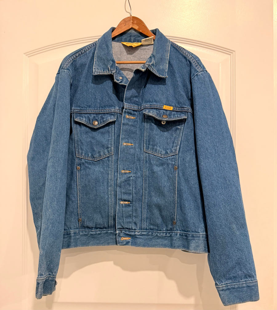 This is a vintage Rustler Trucker jacket with a 90s cowboy theme. This jacket stands out from other jean jackets with its pockets, brass buttons, and unique front seam with brass rivets.