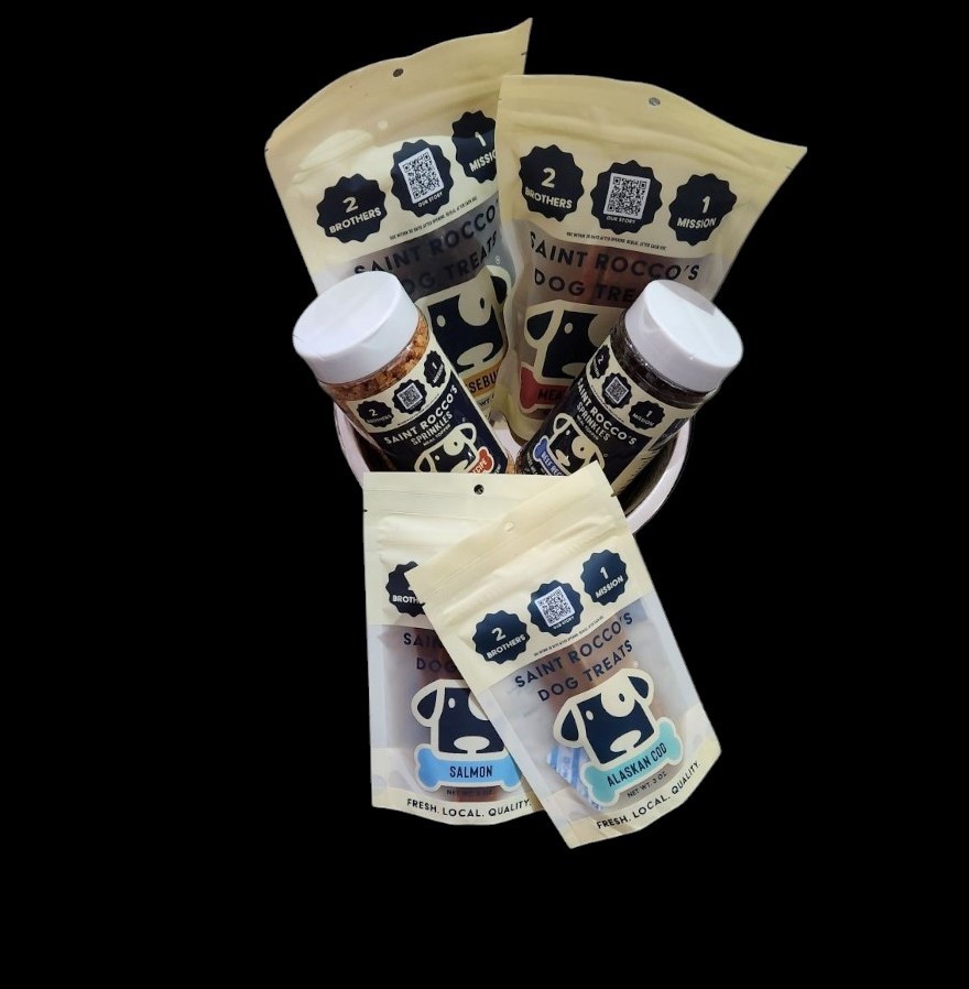 Large dog bowl 2 sprinkles (beef & chicken) 2 small treat bags (Alaskan cod & salmon) 2 large treat bags (meatlovers & cheeseburger)