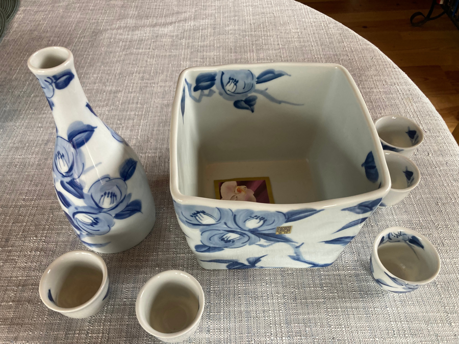 Enjoy your Sake in this lovely Blue and White Sake set. Seven ( 7) beautiful pieces make up this never used Japanese Sake set. Wonderful for entertaining, Sake sets are also utilitarian pieces of art.