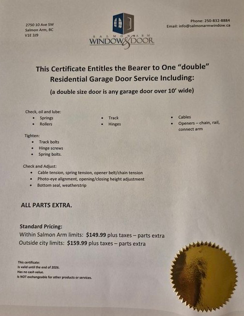 This certificate is for a residential garage door service for a double garage door. A double-size door is any garage door over 10' ft wide. Services included are: check, oil and lube, tightening, and adjustments as needed for smooth operation. Parts are not included. Full description of the service is in the photo section. At Salmon Arm Window & Door, we provide sales, installation and repair services – all important factors when considering your next Window, door, or overhead garage door. Whether you’re building a new home or need repairs, our services ensure that the results meet the highest standards.
