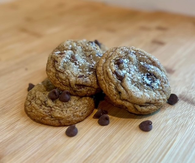 One dozen salted brown butter chocolate chip cookies - chewy cookies made with toasty brown butter, tons of chocolate chips, and topped with flaky Maldon sea salt. Baked by Made with Love by Alexandra, these delicious cookies will stay fresh frozen through mid-July 2026.