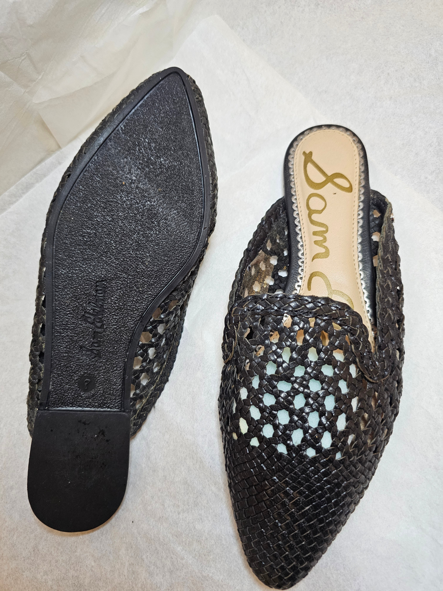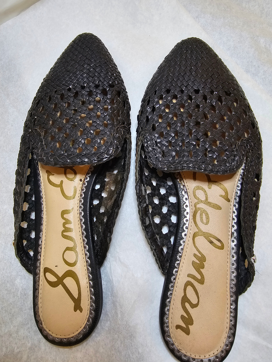 Elevate your everyday rotation with these stunning Sam Edelman Clara Mules. Intricately woven in 100% black leather these mules are beautiful with a breathable texture that’s perfect for transitional weather. Designed with Sam Edelman’s signature cushioned insole and flat heel for effortless, all-day wear. The sophisticated pointed toe instantly dresses up any casual outfit. Note: These shoes do show some wear on the inner surface. Price reflects this imperfection