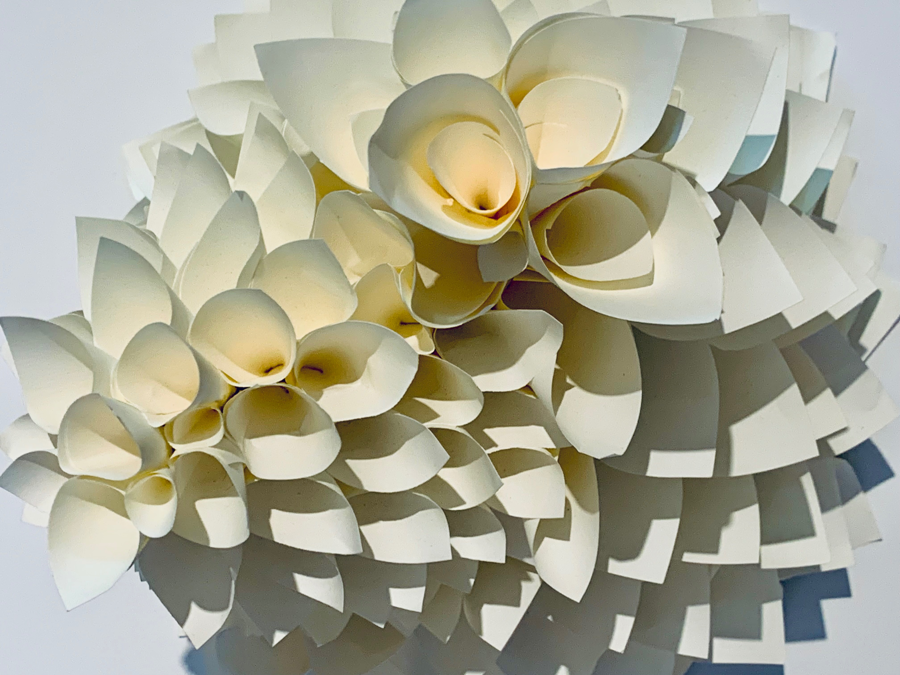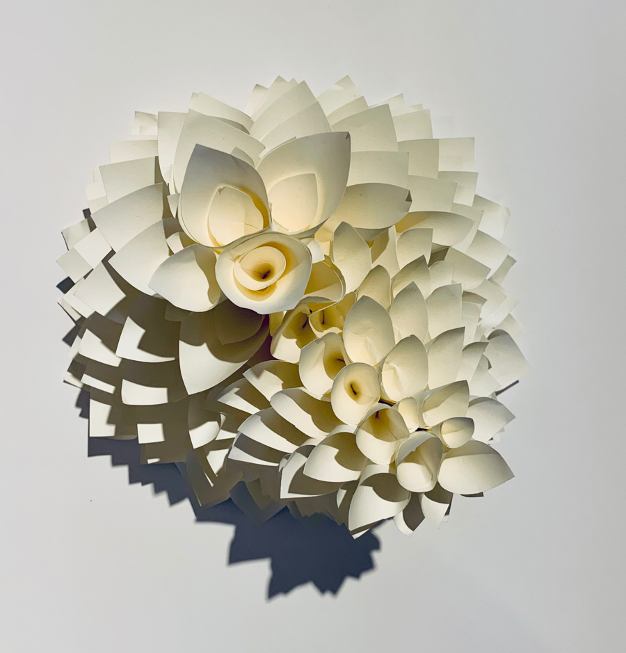 Samuelle Green, "Heads or Tails 2" 12 x 12 x 9.5 inches Paper, wire, glue Artist Bio: A native of Honesdale, Pennsylvania, Samuelle Green’s upbringing in a rural town surrounded by nature, artisans, and craftspeople shaped her creative path. Early apprenticeships with local artists fostered her interest in multidisciplinary approaches, which she formalized through studies at the Tyler School of Art in Philadelphia and Parsons School of Design in New York. Green spent nearly two decades in Brooklyn as a freelance artist and fabricator, contributing to diverse projects, including large-scale installations for other artists, museums, set designs, murals, sign painting, and window displays. This period honed her technical expertise and broadened her perspective on creative processes. Eventually, she relocated her studio to her hometown, where she now focuses exclusively on her personal work. Artist Statement: