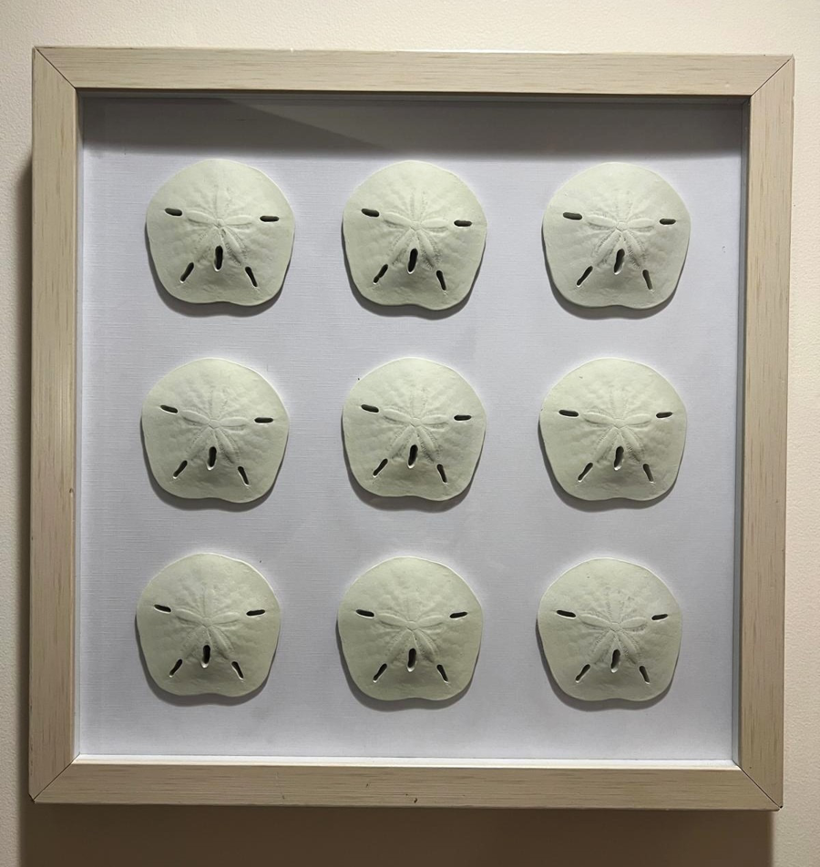Nine authentic sand dollars framed in a 17”x17” white shadowbox. Bring the feel of the beach home.