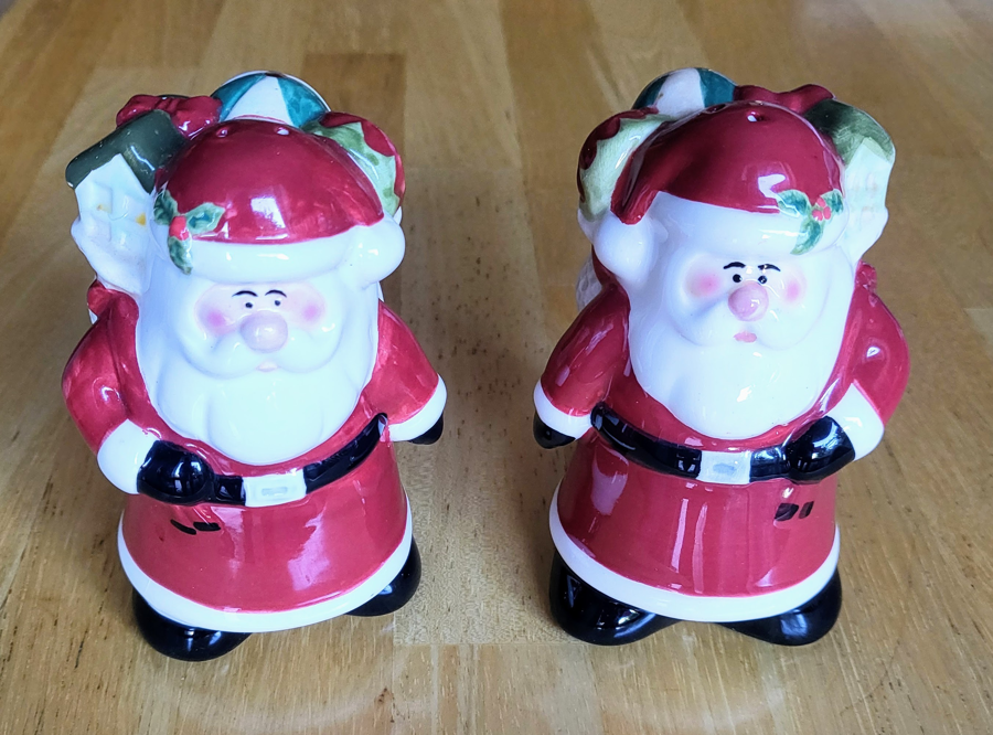 Make your holiday table jolly with this salt and pepper set! Santa with his bag of toys will help season your foods while adding a festive touch! Each measures about 4" tall x 2.5" diameter. Also see our holiday napkin rings and candle holders to complete your decor.
