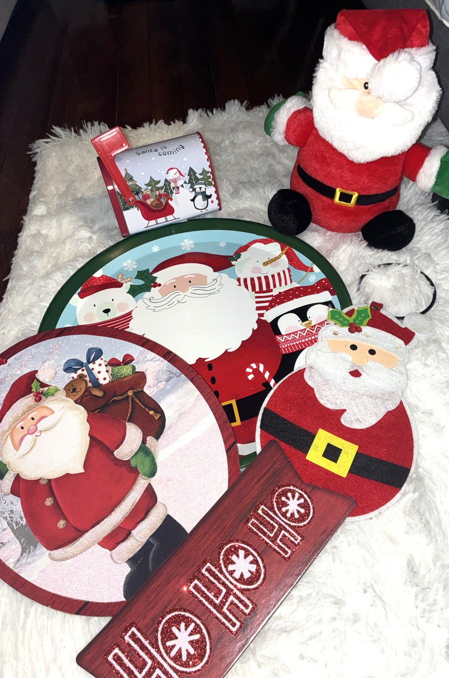 Santa Door Hanger, Santa Wall Hanging, small Santa mailbox, Santa plush, Santa tin tray