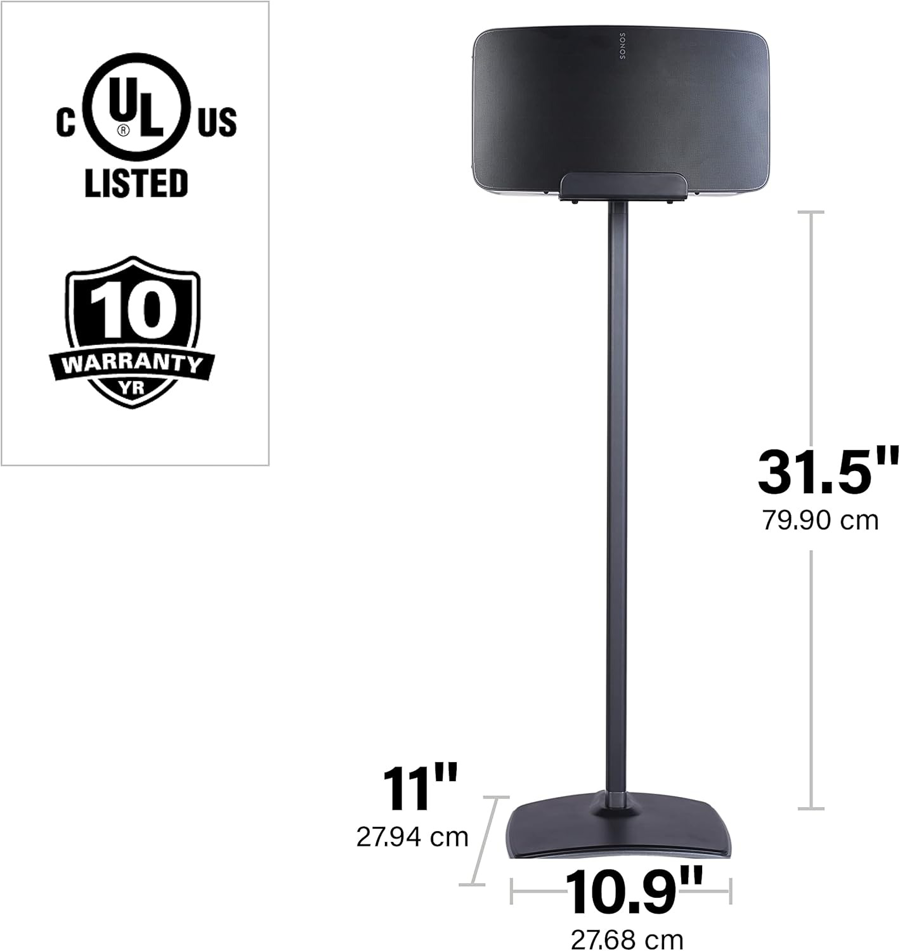 Introducing the Sanus Wireless Speaker Stand designed specifically for the Sonos Five or PLAY:5. This sleek black stand allows for versatile positioning, whether you prefer a vertical or horizontal orientation. Elevate your audio experience while ensuring your speaker is stylishly displayed and securely held.