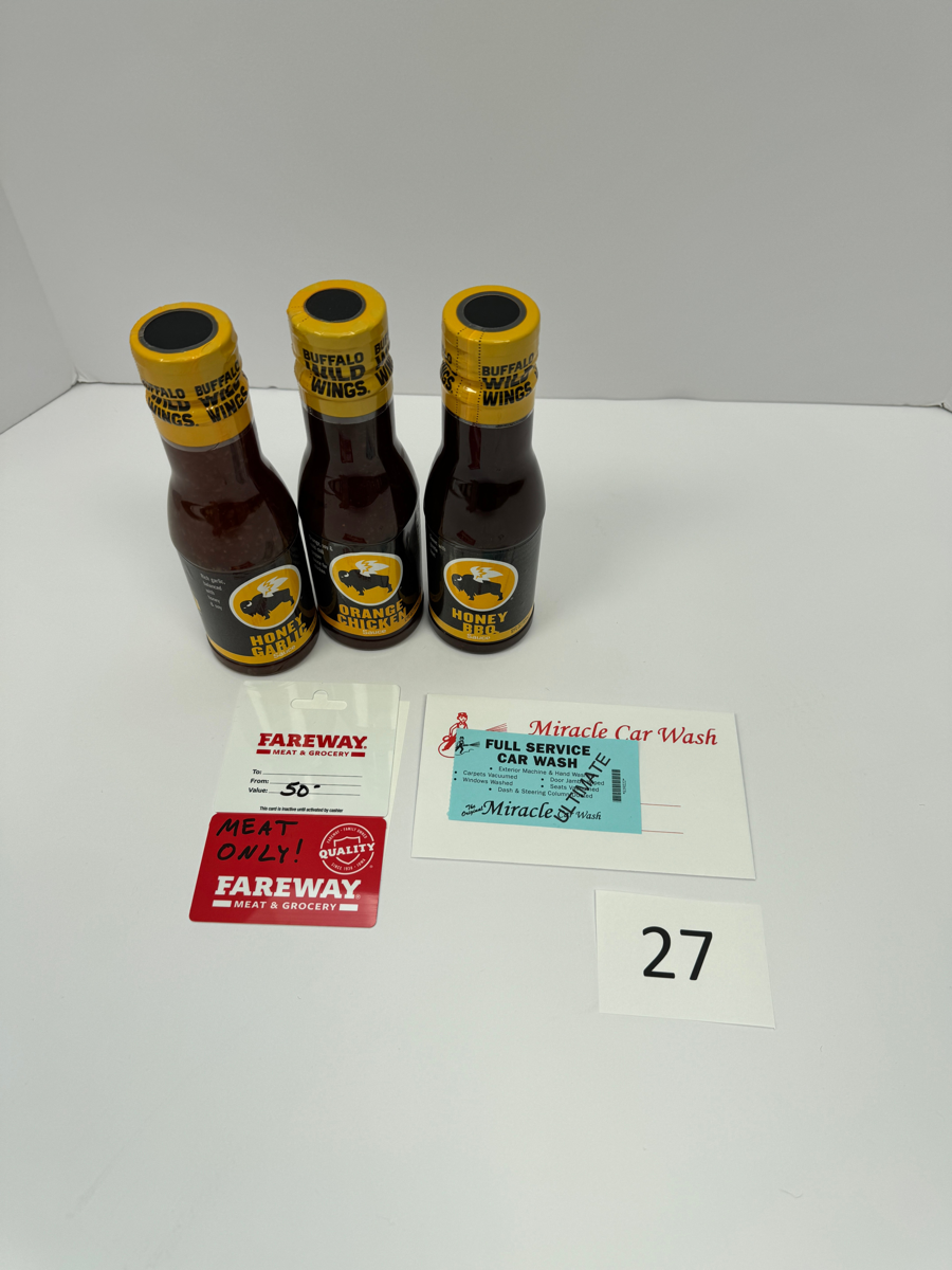 3 Buffalo Wild Wing Sauces, Ultimate Car wash, $50 Fareway (Meat Only)
