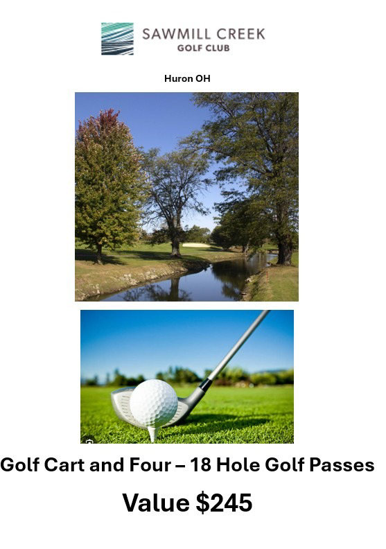Experience the ultimate golf getaway at Sawmill Creek by Cedar Point Resorts! This auction offers a fantastic opportunity to enjoy 4 - 18 hole golf passes, complete with a golf cart, at one of the most scenic courses in the area. Whether you're a seasoned golfer or just looking to have some fun on the greens, this golf excursion promises a memorable day surrounded by beautiful landscapes. Don't miss your chance to tee off at Sawmill Creek! Please pick Gift certificate at close out desk!