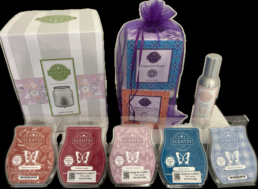 Your home will smell amazing with these Scentsy products! Enjoy a full-sized Soft Honey Warmer, 5 refill waxes, Dainty Fragrance Flower, and a room spray.