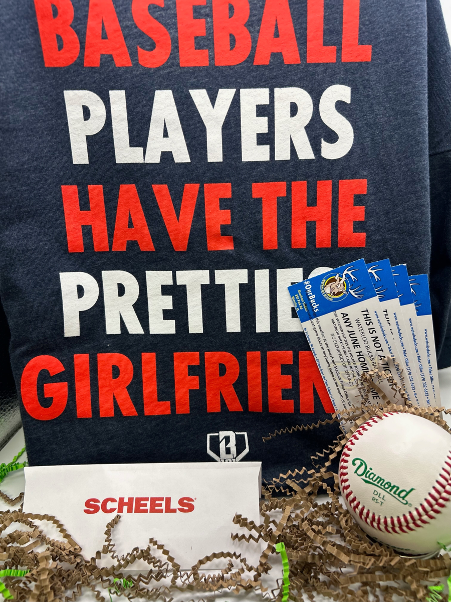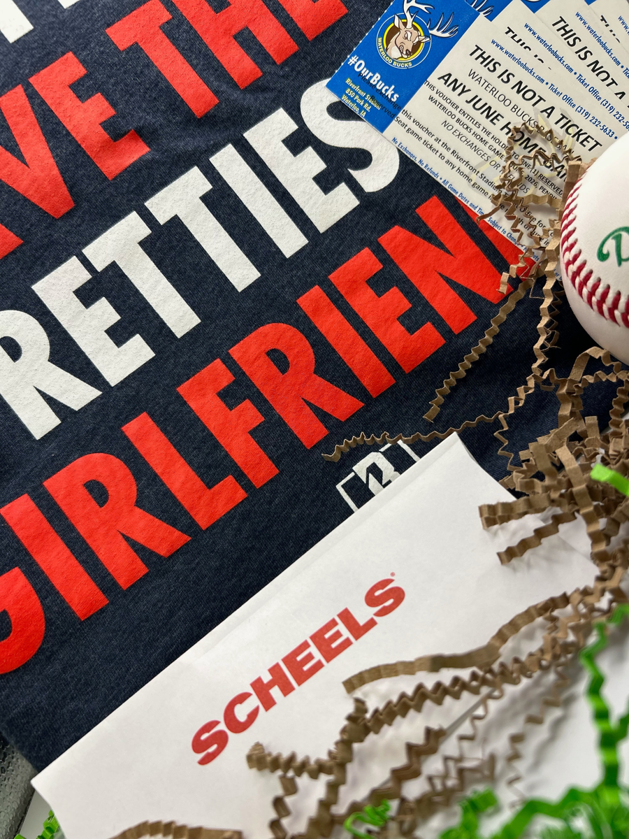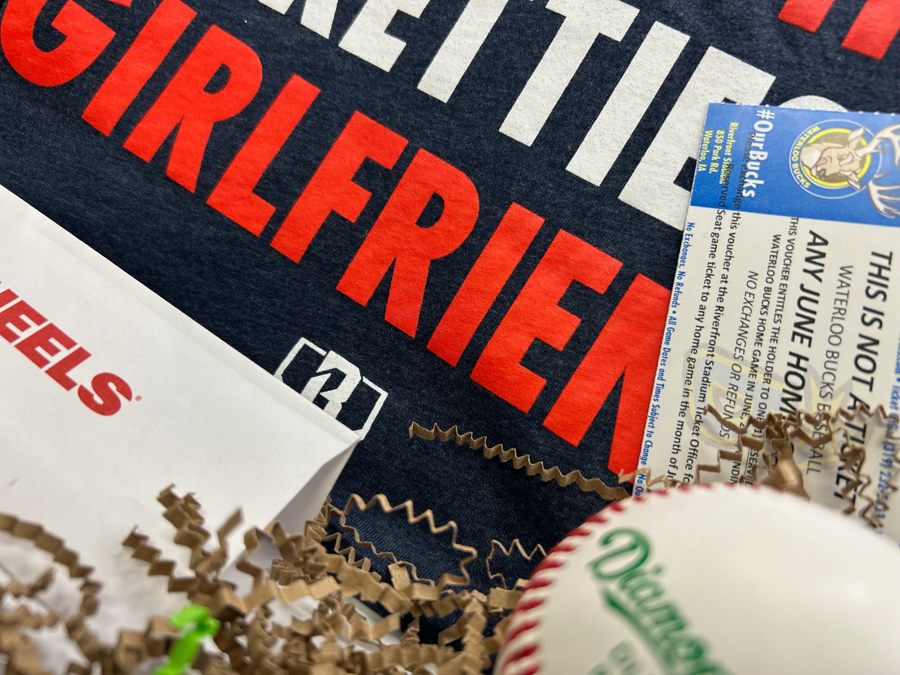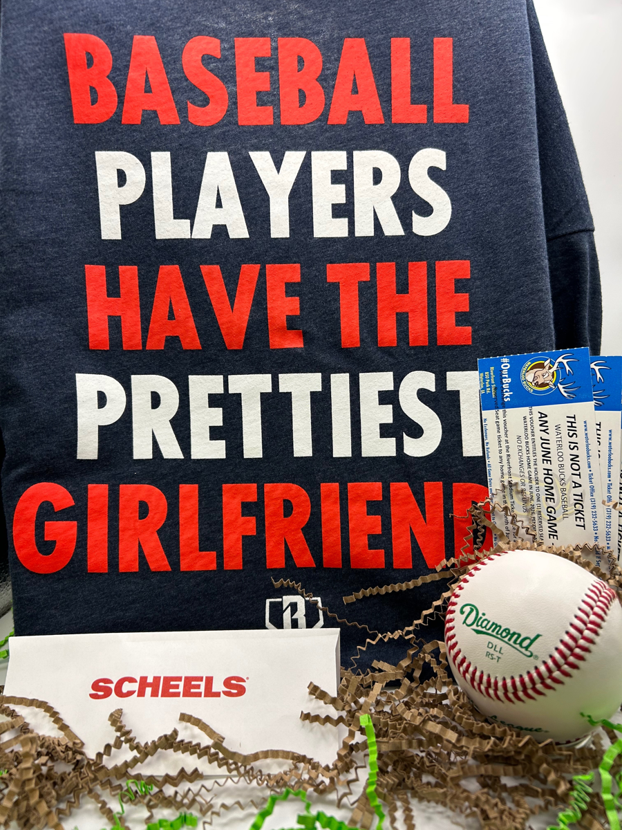 Step up to the plate with this fun, baseball-themed package! Perfect for fans and players alike, it includes: • 4 Waterloo Bucks tickets – enjoy the game live • XL Baseball Shirt – featuring the cheeky slogan, “Baseball players have the prettiest girlfriends!” • Official baseball – for practice or display • $25 Scheels gift card – gear up for your next game Hit a home run with this package that’s sure to bring fun and fandom together.