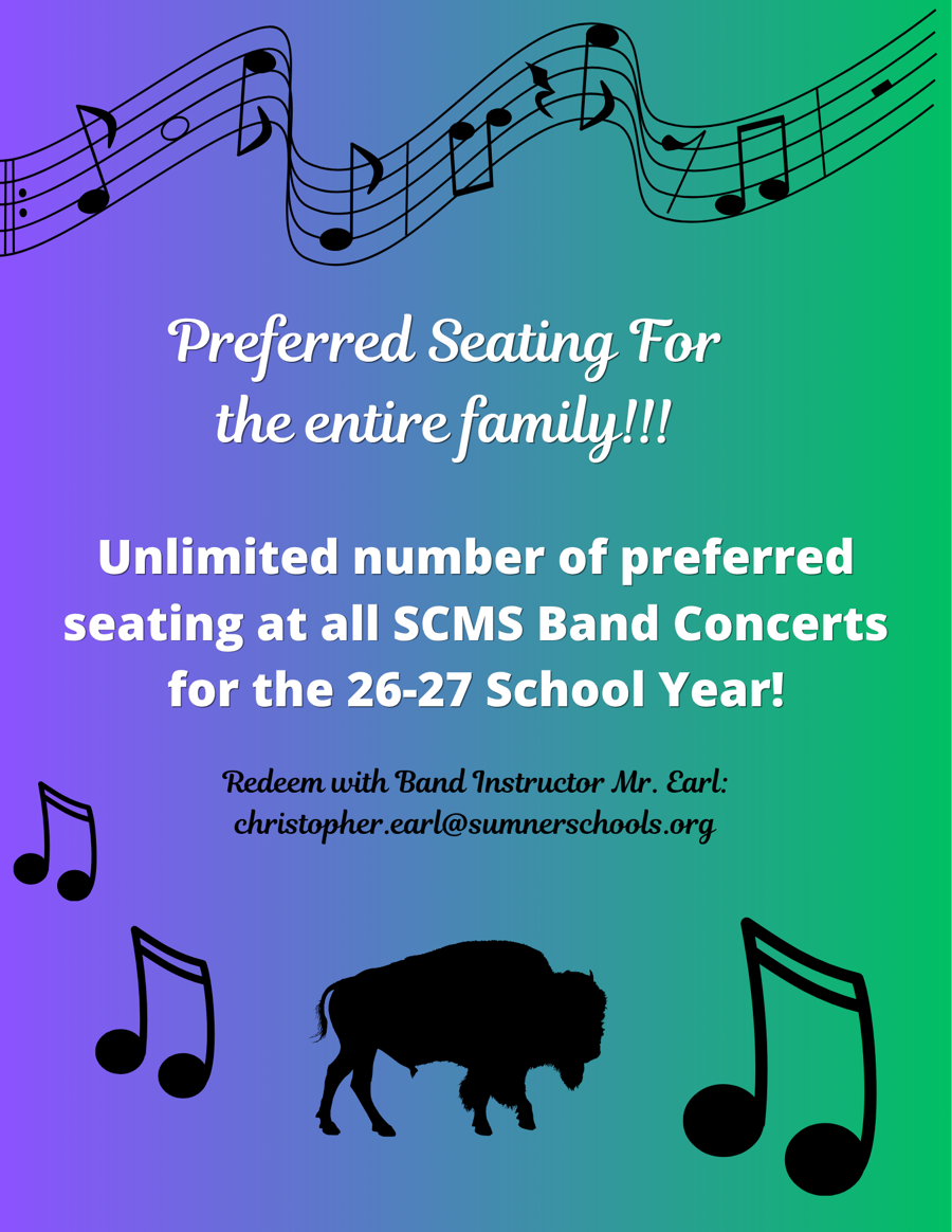 Experience the ultimate in comfort and convenience with our SCMS Band Preferred Seating auction item. This exclusive offer provides unlimited preferred seating for you entire family at all SCMS Band performances during the 2026-2027 school year.