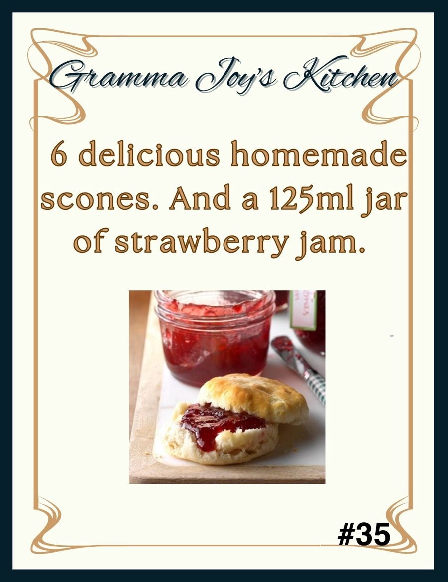 From the Kitchen of Gramma Joy comes 6 delicious homemade scones and a 125ml jar of homemade strawberry jam.