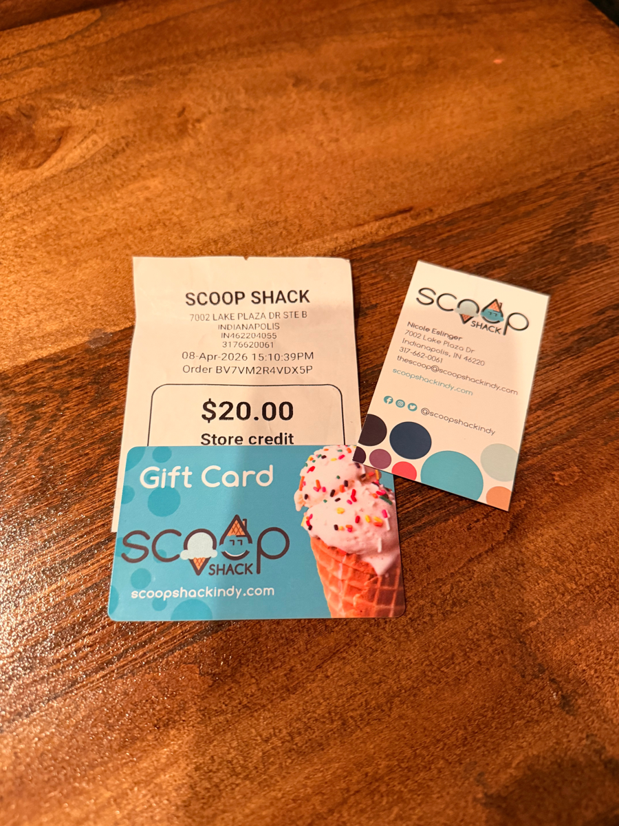 Treat yourself to something sweet with this $20 gift card to Scoop Shack! A local favorite for delicious ice cream and frozen treats, Scoop Shack is the perfect spot to cool off and satisfy your sweet tooth.