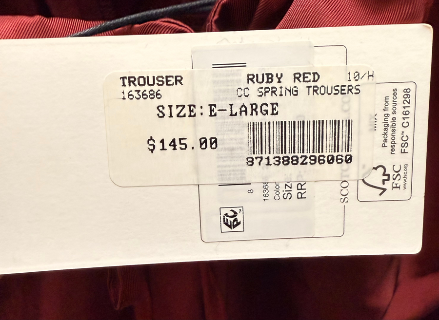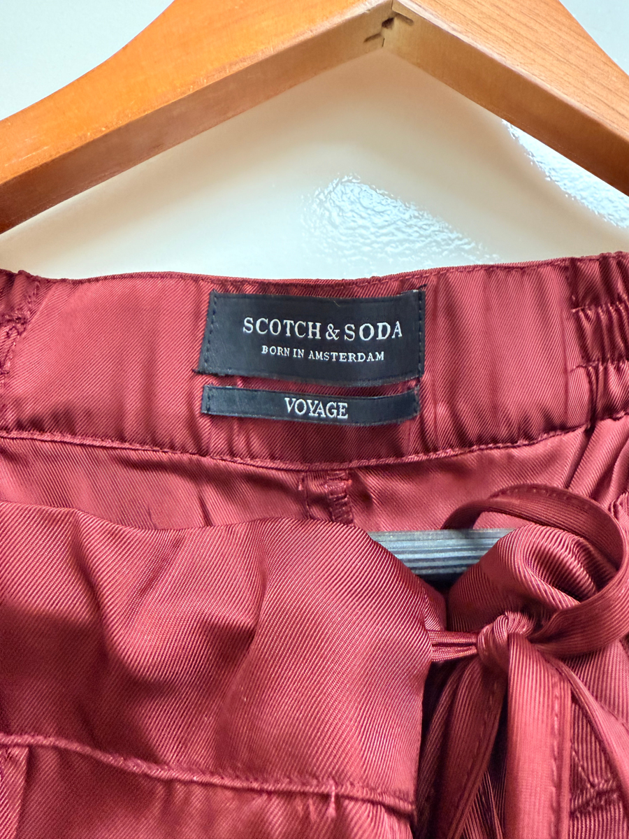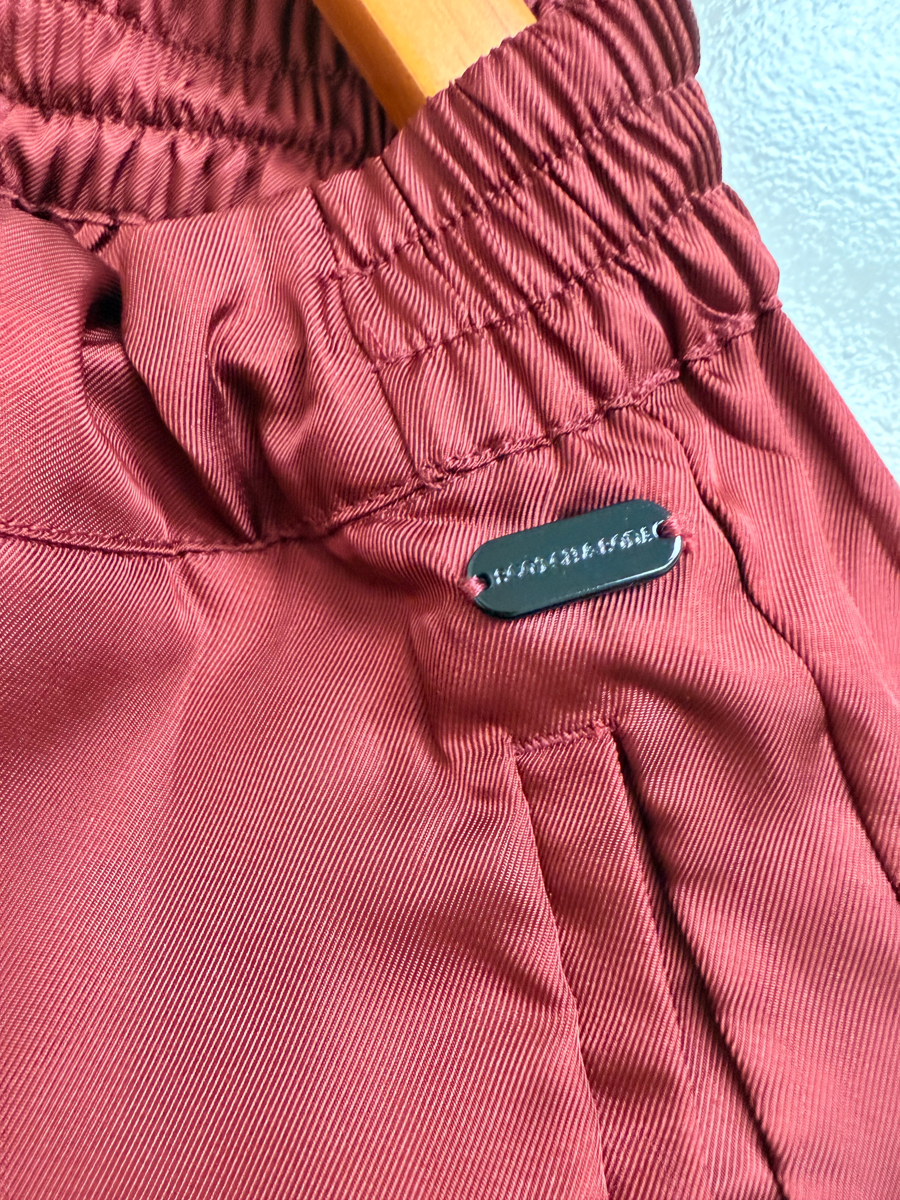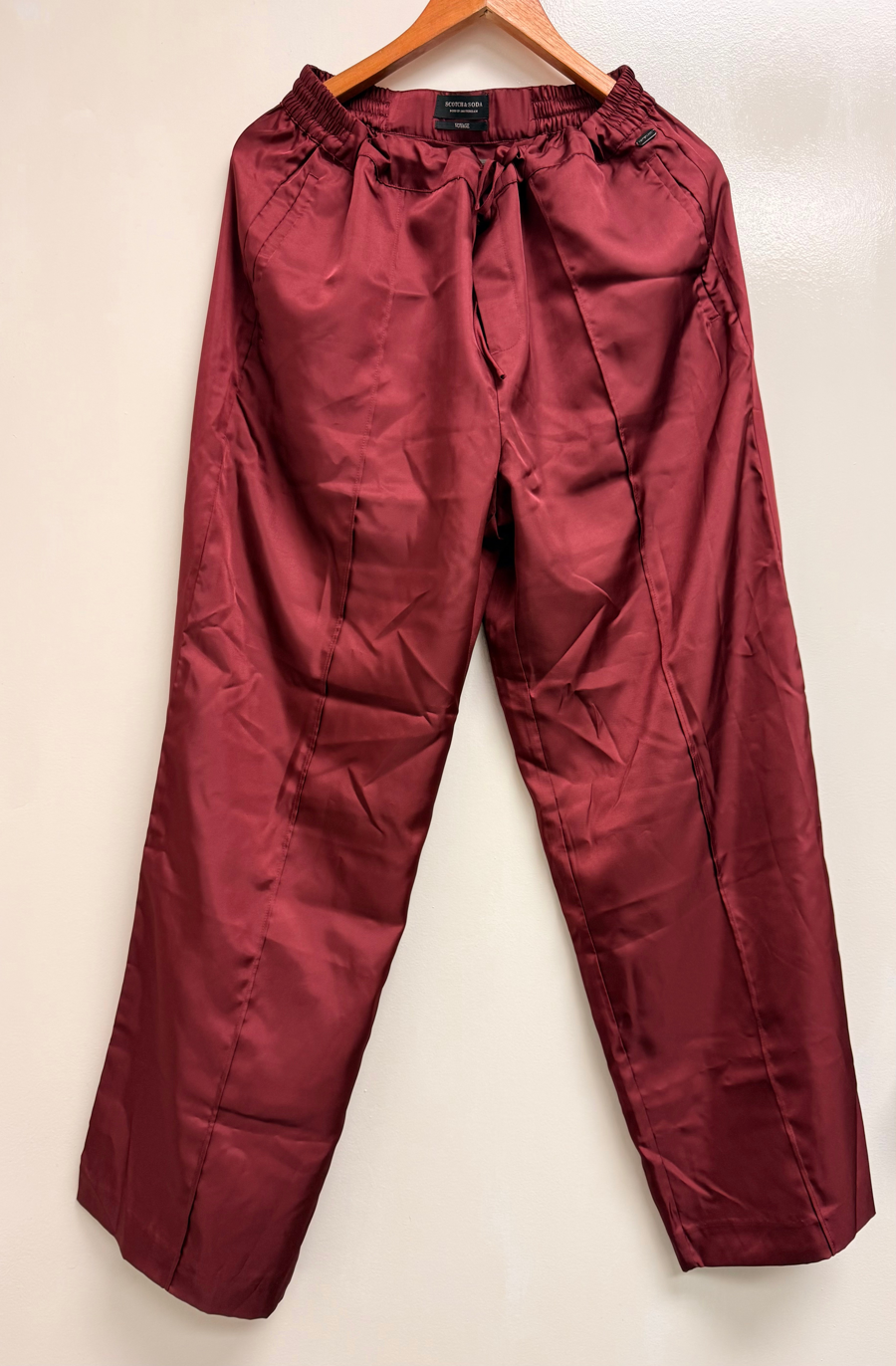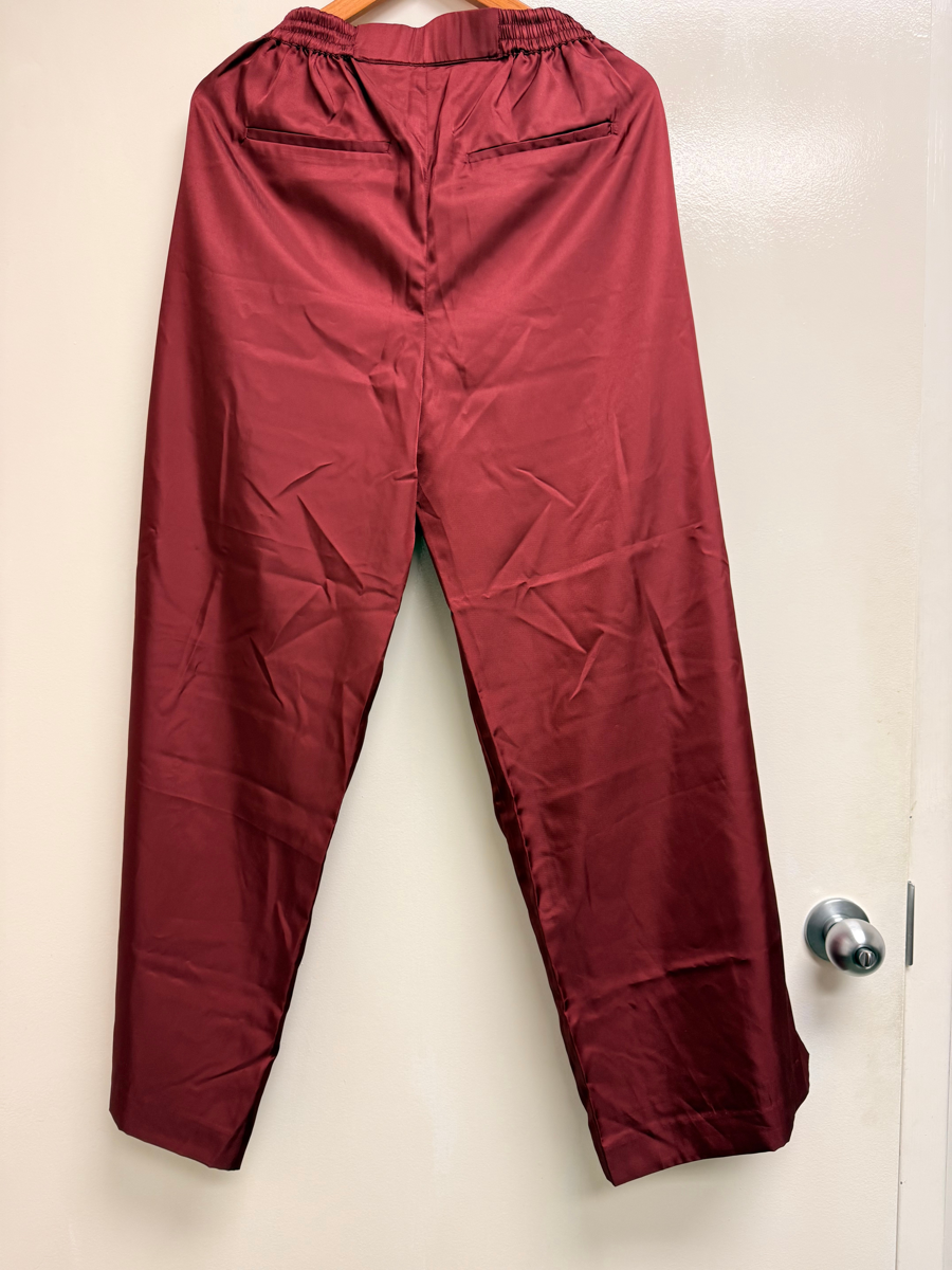 Just in time for Christmas brunch! These pair of wide leg ruby red light weight trousers have a draw string elasticized waist, front and back pockets, and edging down the front. Color: Ruby Red Condition: Brand New Size: E-large, waist is 36inches, length is 42inches