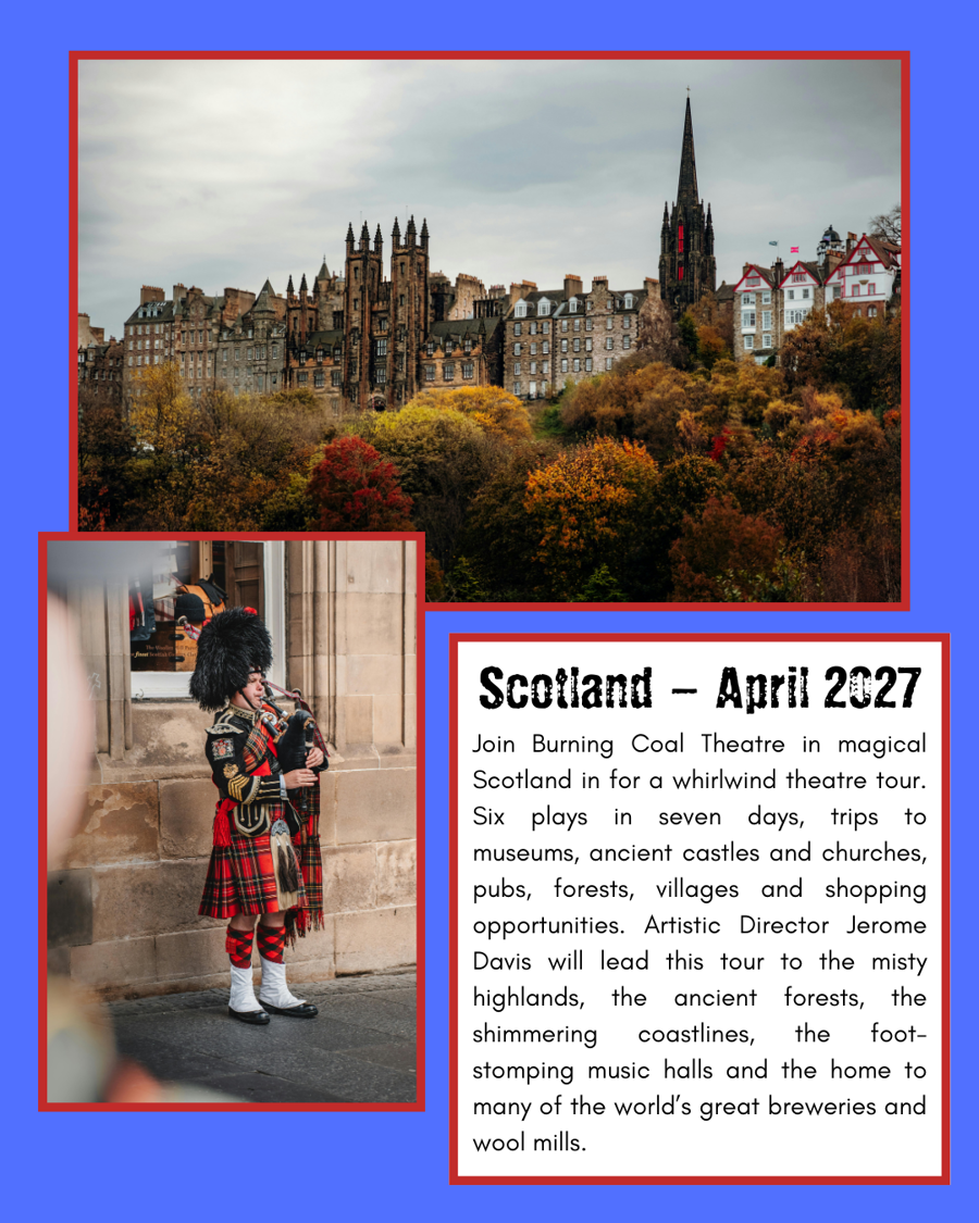 Join Burning Coal for our annual theatre tour in April 2027 to the beautiful country of Scotland. Six plays in seven days, trips to museums, ancient castles and churches, pubs, forests, villages and shopping opportunities. Artistic Director Jerome Davis leads this tour to the misty highlands, the ancient forests, the shimmering coastlines, the foot-stomping music halls and the home to many of the world’s great breweries and wool mills.