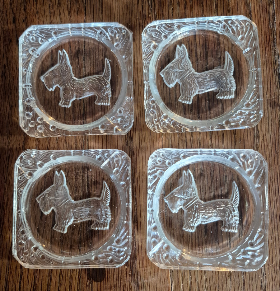 Four vintage dishes, 2.5" square. Can be used as ashtrays or condiments dished. Very cute Scottie dogs