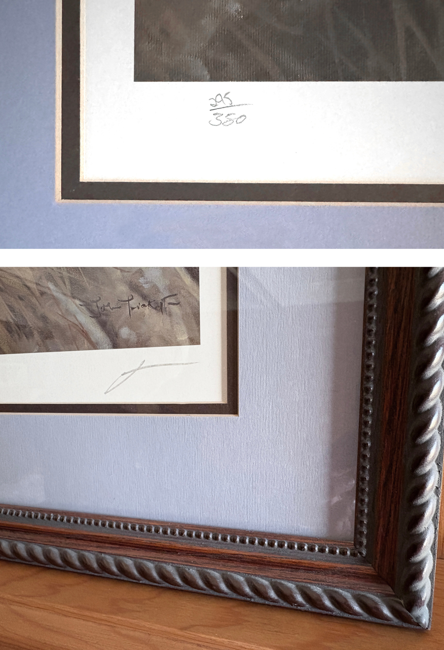 The signed print measures 26 ½” x 20” and is numbered 295/350. It is double matted and presented in a refined wooden frame, bringing the full size to 31” x 25”. This piece comes from a private collection generously donated to the Border Collie Bazaar. Due to its size, shipping and handling costs are higher than for other listings.