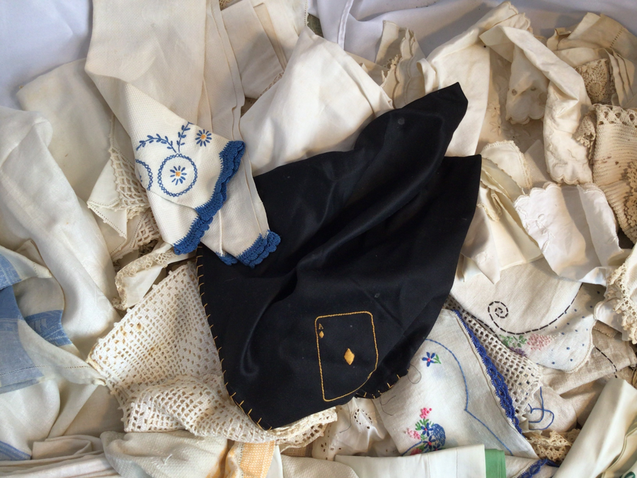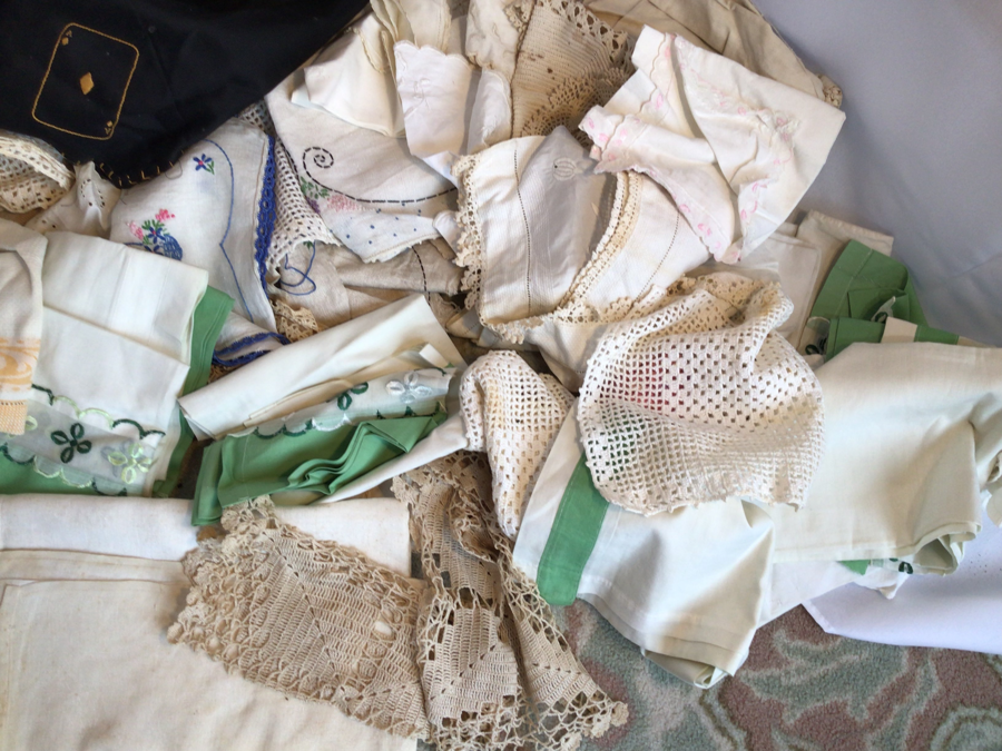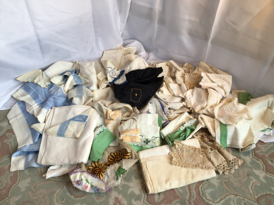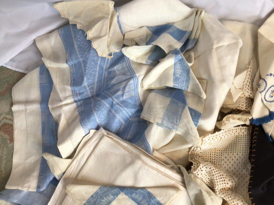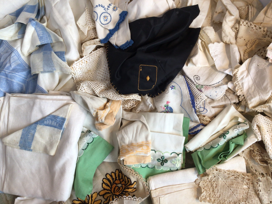 Vintage and antique pieces Doilies, deco linen tablecloth and napkins,, runner, doilies, pillow covers, embroidery, crochet and so much more Pieces are spotted or scrappy - good group for craft
