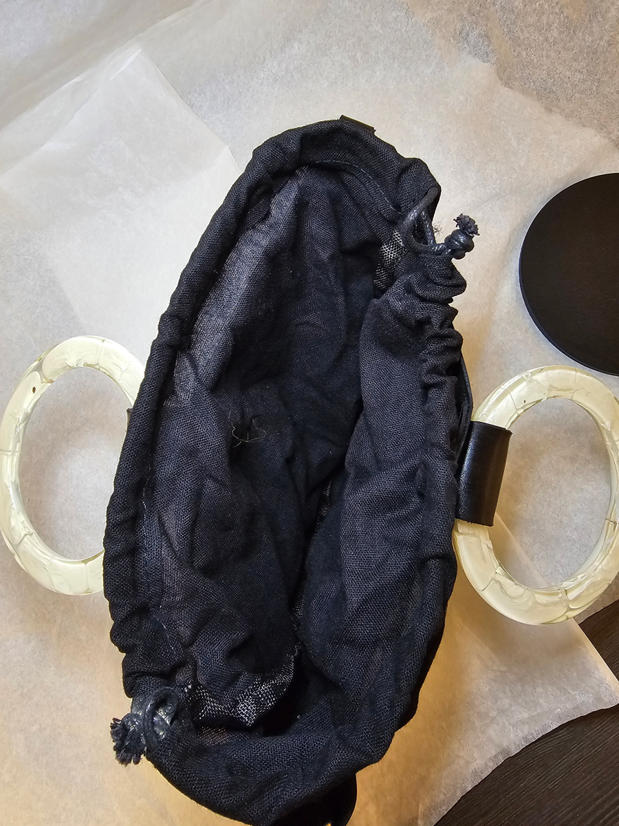 Make a bold, sophisticated statement with this stunning vintage-inspired patent leather tote. Perfect for the fashion forward individual who appreciates clean lines and unique artistic details. Features striking oversized ivory resin circular handles that doubles as a piece of wearable art. Transitions effortlessly from a professional workday to an elegant evening out.