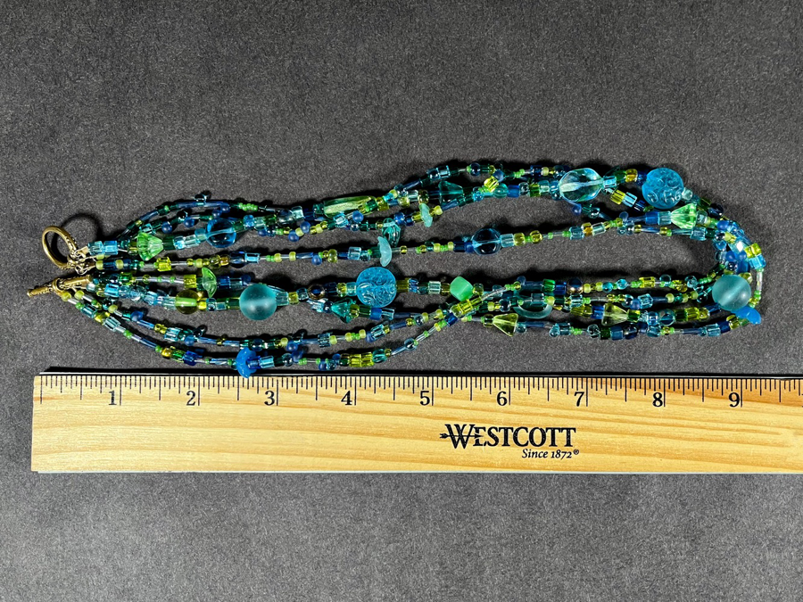 A complete set of Necklace, Bracelet, and earings sea tones of green and blues glass beads. Golod colored clasps and earwires.