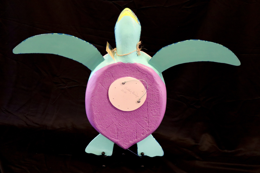 Make a splash with this vibrant handcrafted sea turtle wall hanging by Bobby Bridges. Bursting with cheerful coastal color and playful details—from the patterned shell to the outstretched flippers—this piece brings instant charm to any room.