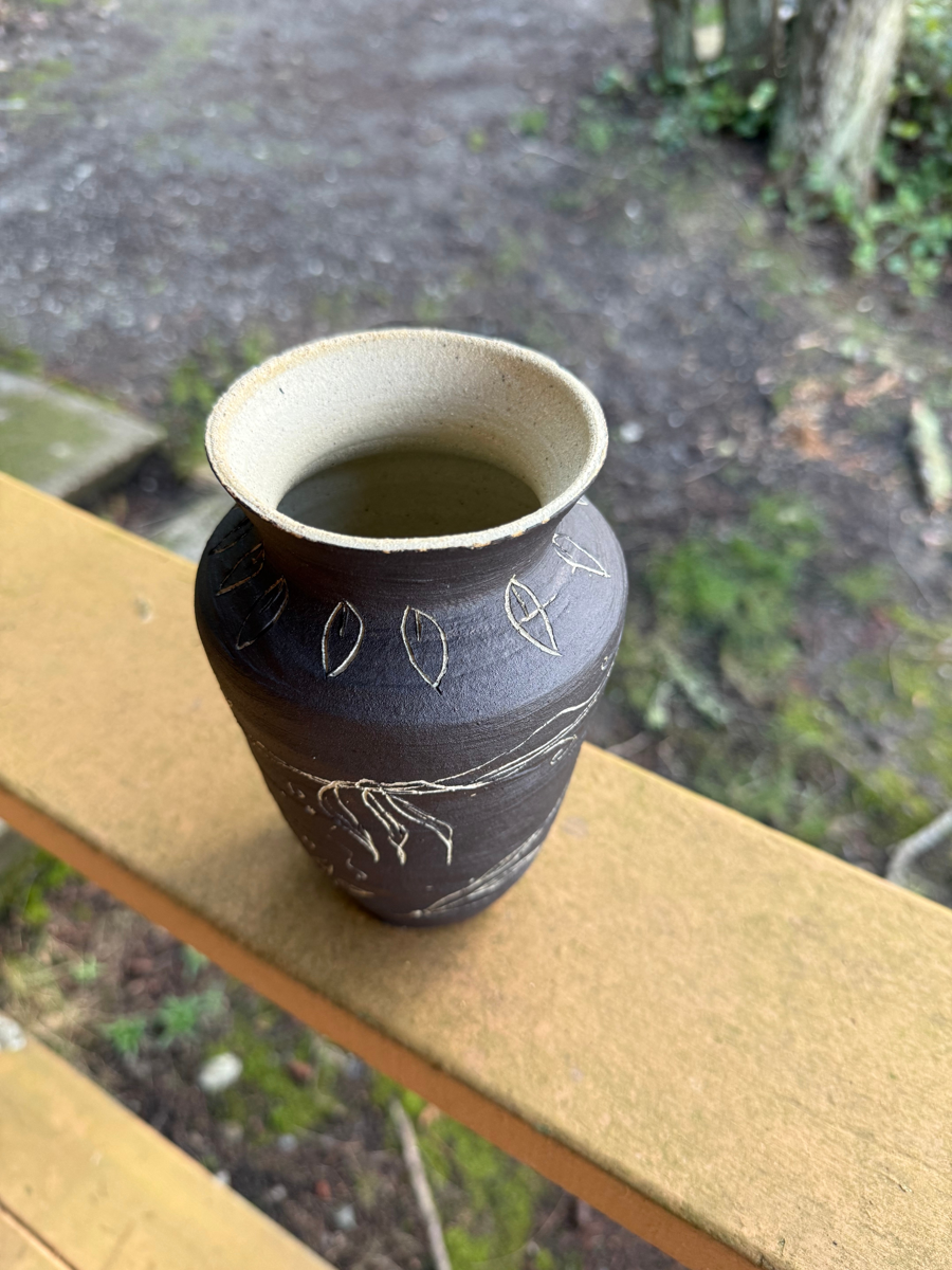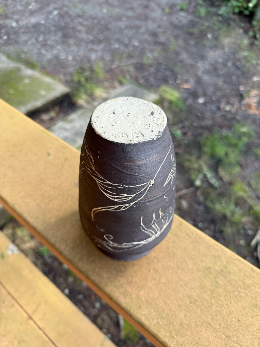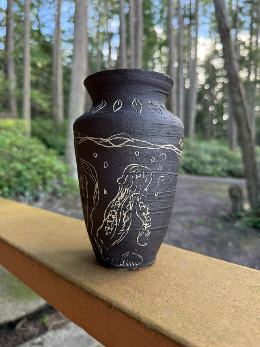 Thrown by staff member Ali Morrow and illustrated by counselor Elodie Texier, this vase evokes and underwater scene off the coast of Canoe Island. It measures 7" tall by 4" wide and has a black slip exterior and raw interior.