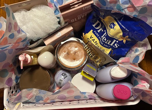 Self-care basket, including: loofahs, body wash, lotion, perfume, a candle, bath salts, etc.