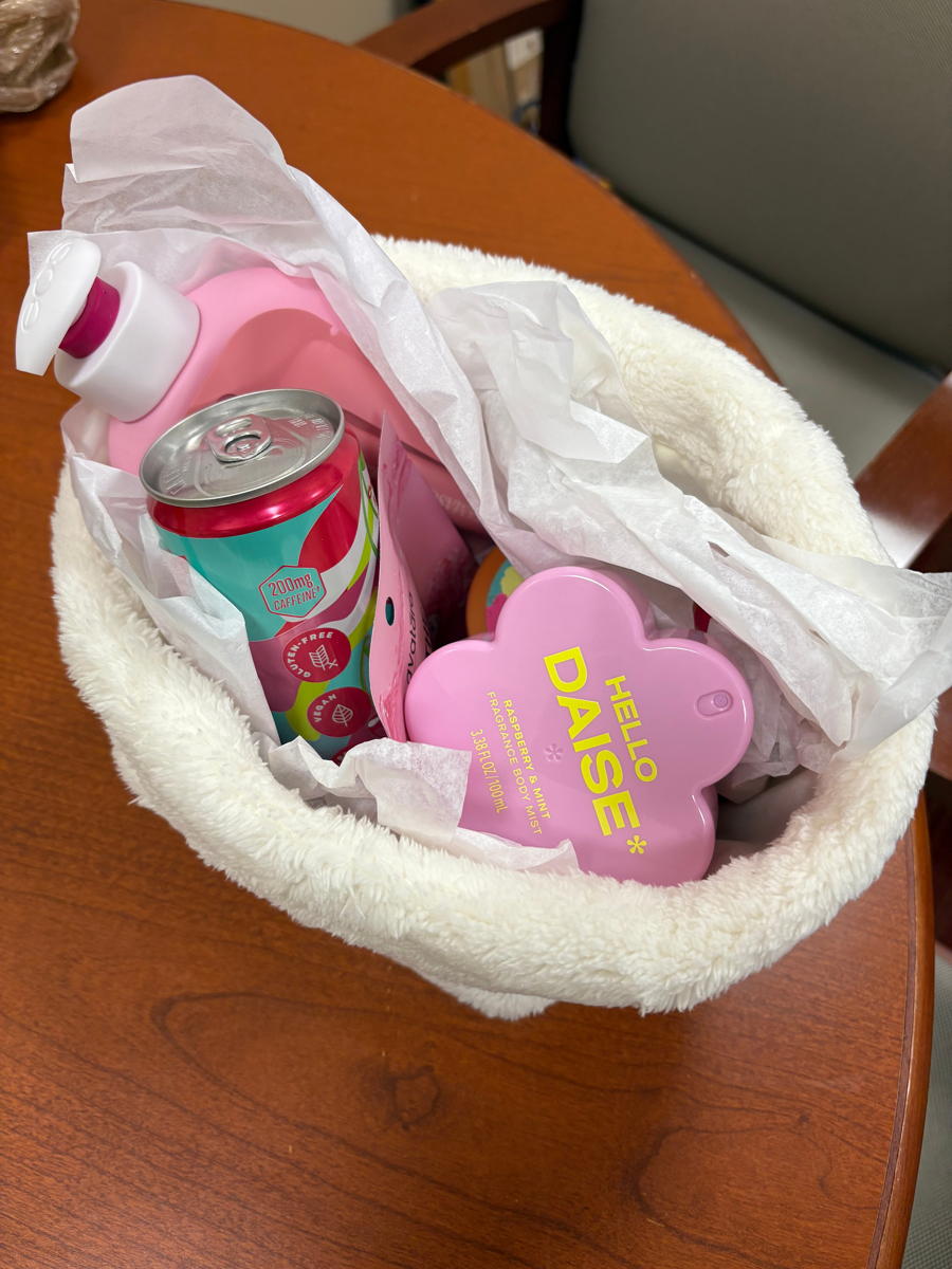 Adorable little basket with - Scented lotion, scented sugar body scrub, perfume, lip butter, energy drink. Take care of yourself! Or give as a gift!