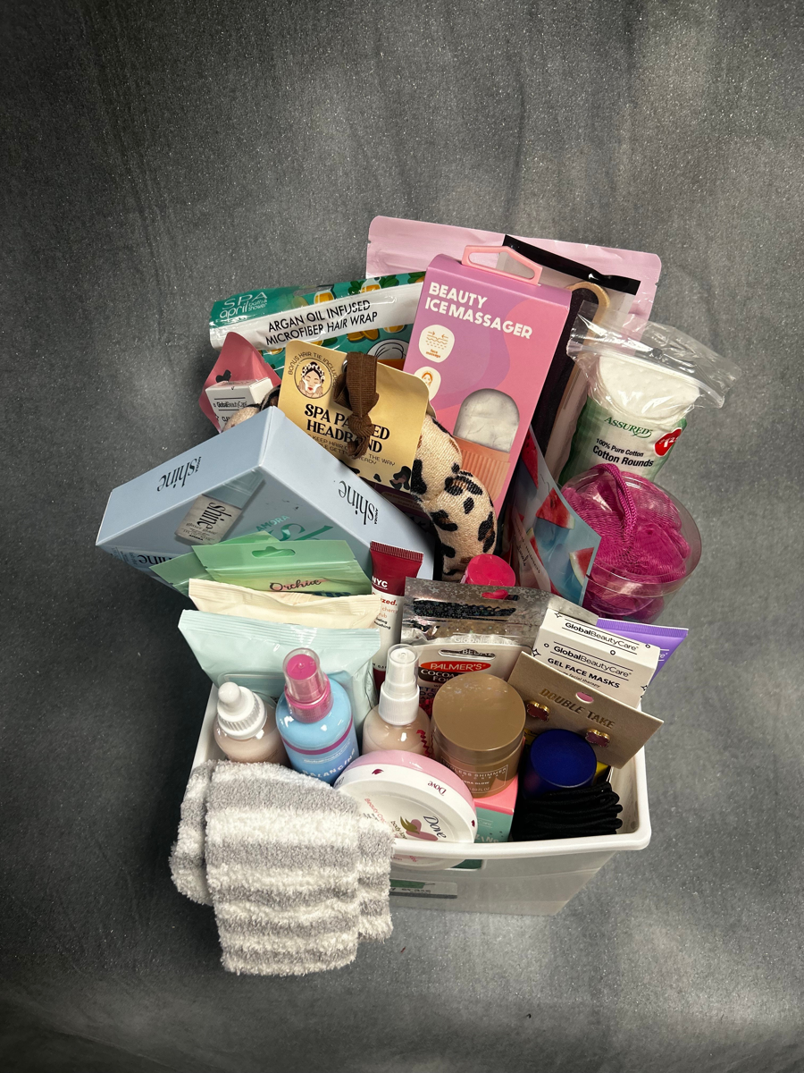 Self Care Essentials Have you been craving a moment to relax and fully pamper yourself? This basket has everything you need. Included in the Basket: Oil Infused Hair Wrap Towel Hydrating Collagen Face Mask (watermelon) Wooden Foot File Cheetah Print Spa Padded Headband Vanilla & Salted Caramel Infused with Essential Oils bath bombs Natural Epsom Salt (Chamomile with Green Tea Extracts) Strawberry Fizz Spray Handsanitizer Cocoa Butter Lip Balm & Jelly Stick Pure Cotton Rounds Micellar Cleansing Water Facial Therapy Clay & Gel Facemasks Retinol & Vitamin C Eyemasks Four Bath Luffas Acne Patches Hair Ties Fuzzy Socks Pink & Gold Earrings Hair Serum, Humidity Mist Shield, Hair Boost Leave in Treatment Daily Cleansing Face Wash Daily Gel Face Lotion Body Cream, Glow Stick, Glow Oil Toner Mist Strawberry and Black Cherry Lip Scrub Milky Facial Hydrator & Facial Milk Serum Ice Face Massager Body Cream Vitamin C & Collagen Makeup Wipes Basket Artists: Makiya Feltner & Halie McFarland