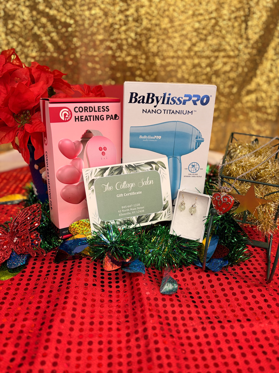 This is contains a BabyblissPRO Hair blower, $28 Gift certificate for a haircut with Jenn at The Cottage Salon, a cordless heating pad and a set of earrings.