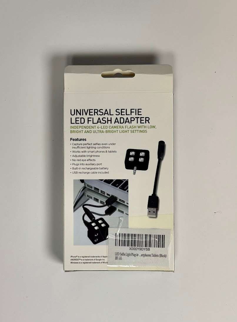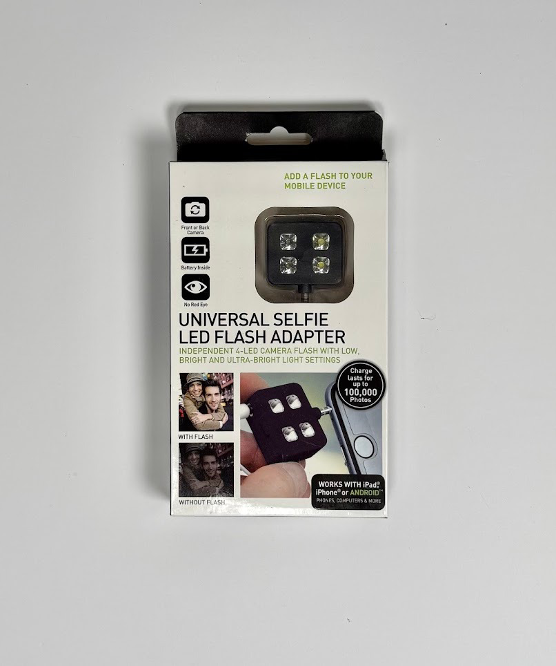 Add a flash to your mobile device with the universal selfie LED flash adapter from Soundlogic. The flash adapter has a built-in rechargeable battery and works with iPhones and tablets. Adjustable brightness level.