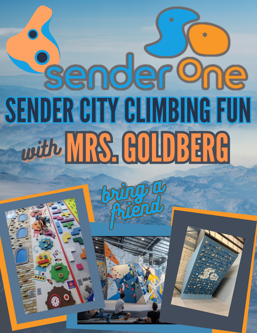 Attention all Thrill Seekers! You and a friend are invited to join Mrs. Goldberg at Sender City in Lakewood! You and a friend can participate in some amazing indoor rock climbing! After our fun time together, we can head over to Yogurtland and cool off!