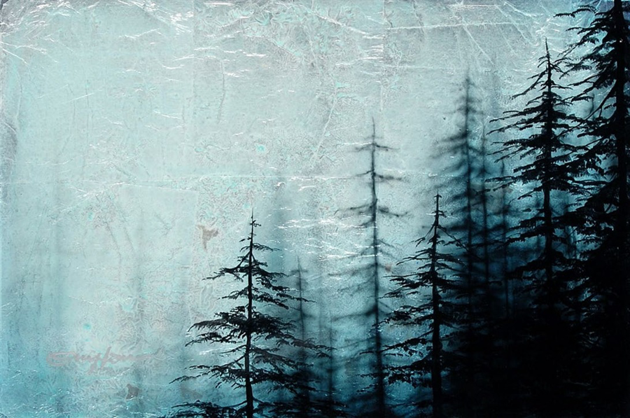 Mixed media on aluminum with sized gold or silver leaf, veined by hand. Hand-signed in