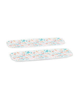 The flowers are fuschia, a deeper pink than in the picture. 3 brand new melamine serviing platters 17.5in L x 6.5in W