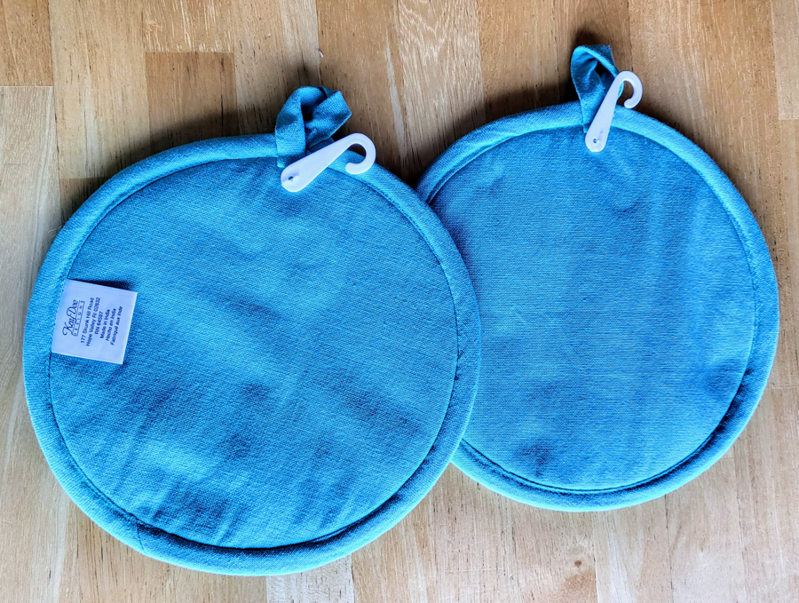 This pair of KayDee Designs 8" round Coastal Holiday potholders juxtaposes a snowman with sea shells and starfish. Lovely aqua, white and tan shades on 100% cotton covering. A unique style for the holidays, would pair PURRfectly with the matching placemats in this auction!