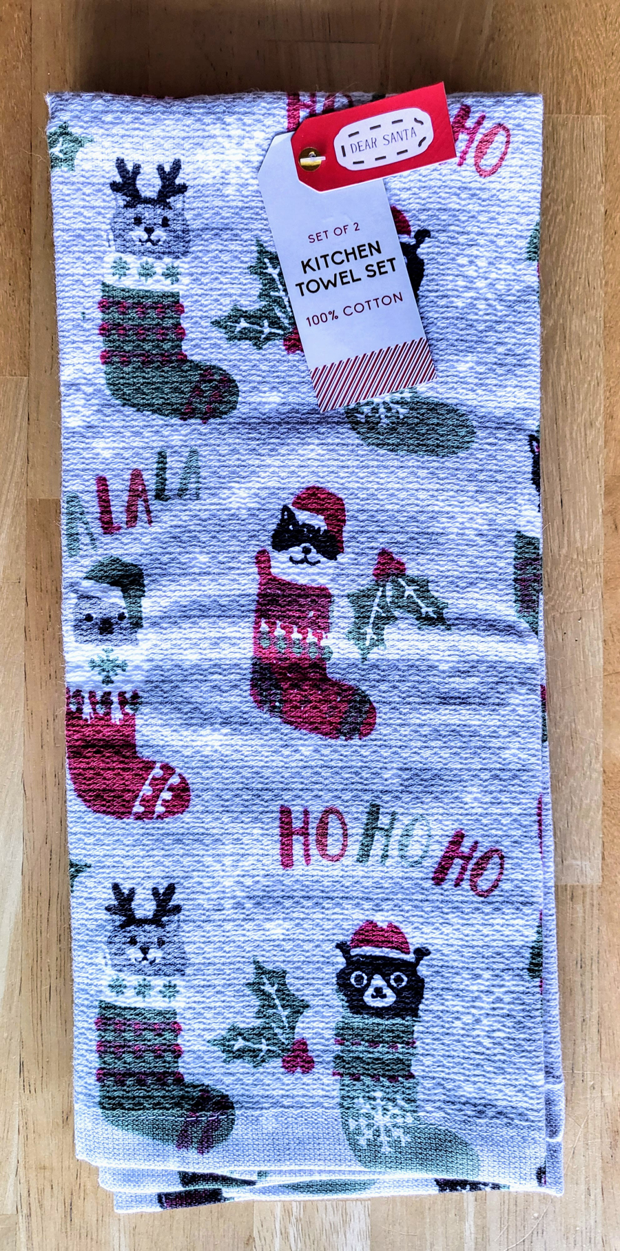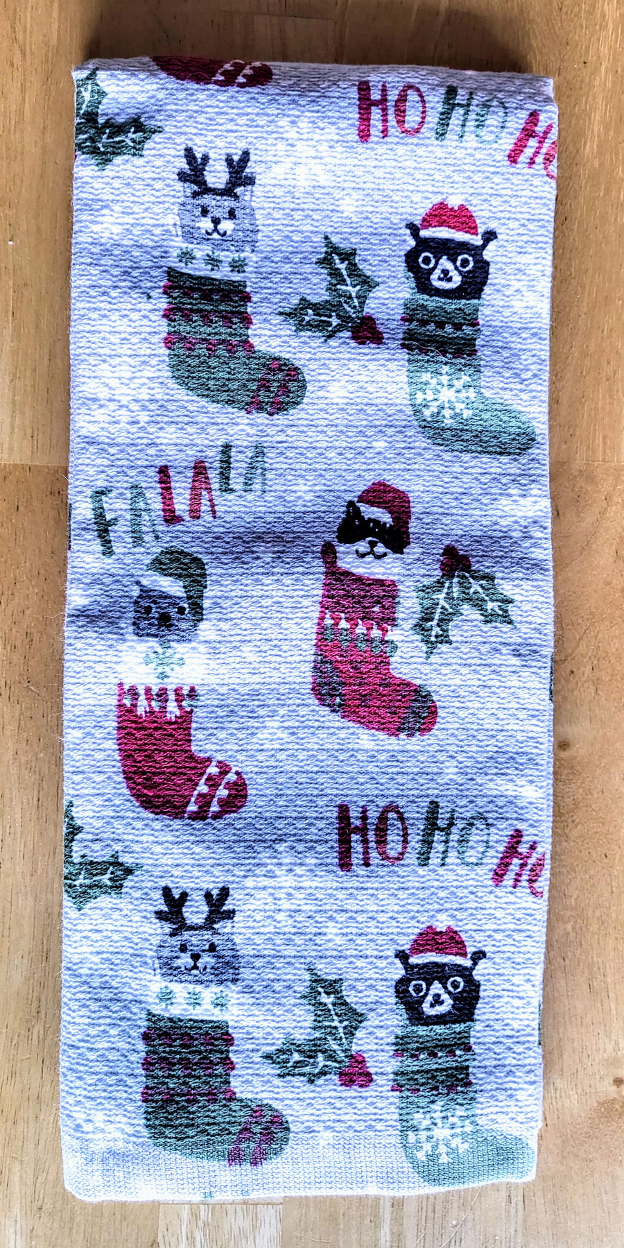 Set of 2 Dear Santa Kitchen Towels with Adorable Animals in Holiday Stockings