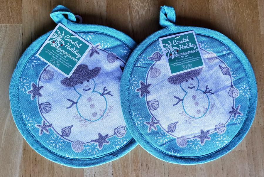 This pair of KayDee Designs 8" round Coastal Holiday potholders juxtaposes a snowman with sea shells and starfish. Lovely aqua, white and tan shades on 100% cotton covering. A unique style for the holidays, would pair PURRfectly with the matching placemats in this auction!
