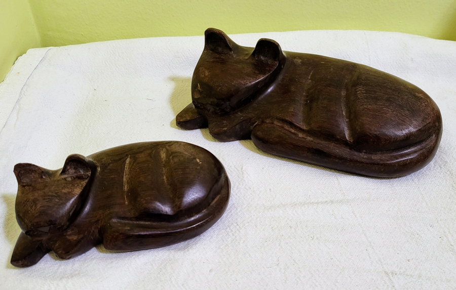 Lovely carved hardwood rendition of a pair of sleeping kitties! Large one measures about 9.5" x 4" and small one is approximately 5" x 3".