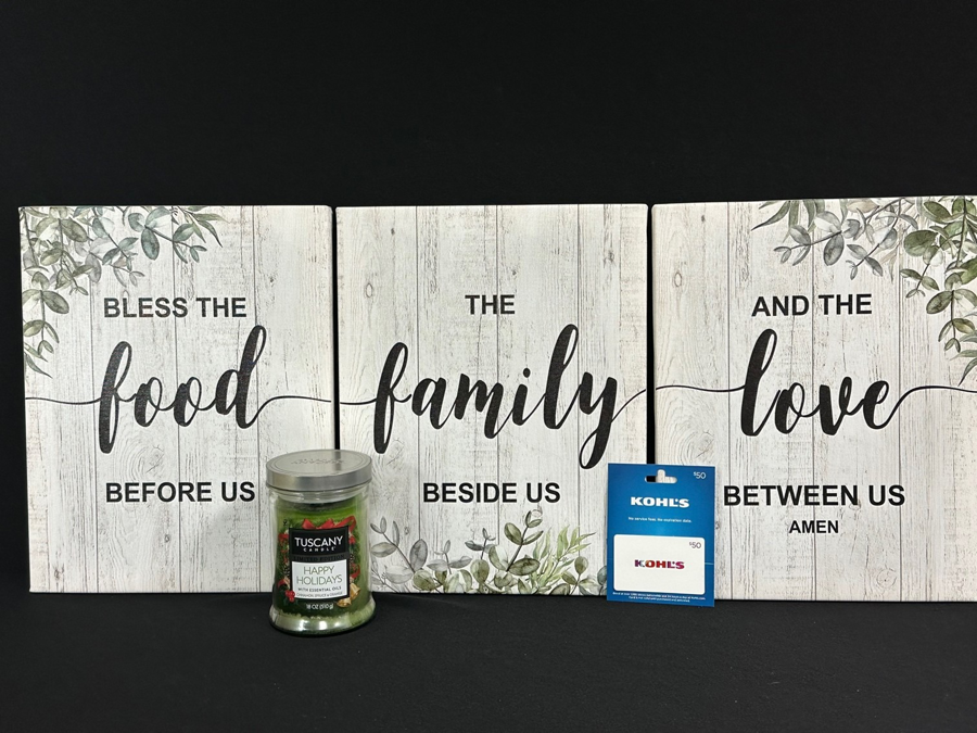 Set of 3 Canvas/Tuscany candle-Happy Holidays/$50 Kohl's gift card
