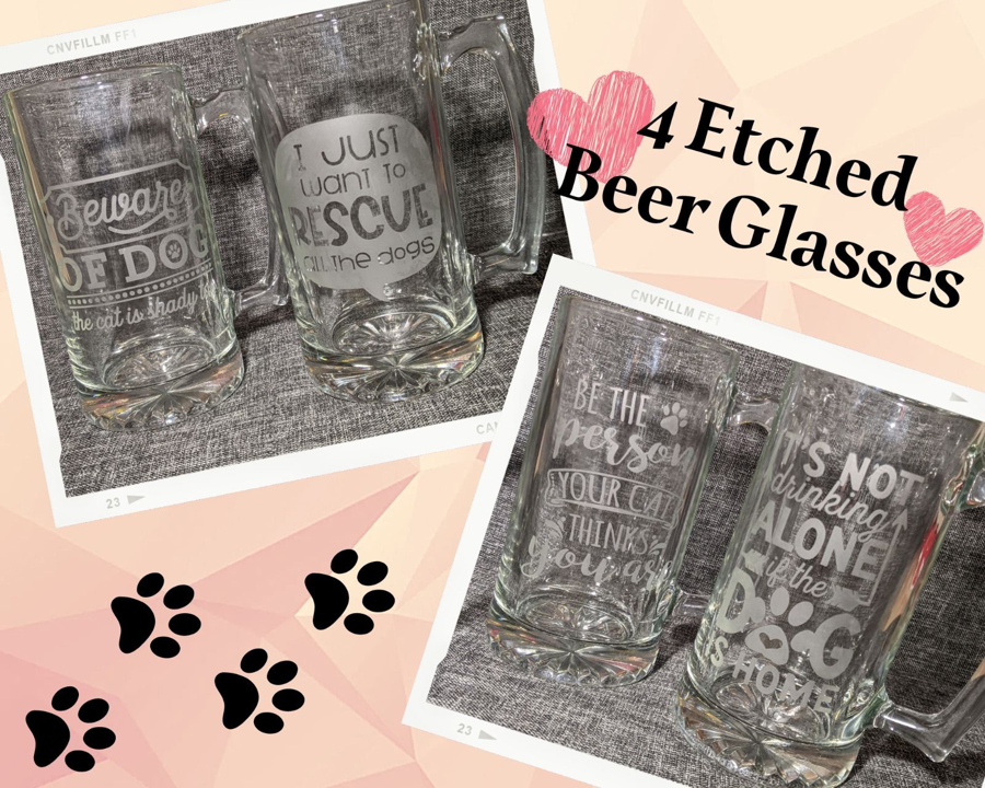 Raise a toast to your pets with this set of 4 large, 26.5-ounce custom beer mugs! Personalize each mug with your pets' faces, names, or special phrases, or select from over 200 available designs. These sturdy, etched beer mugs are perfect for pet lovers who want to enjoy their favorite brew in style. This set makes a unique and thoughtful gift for any occasion.