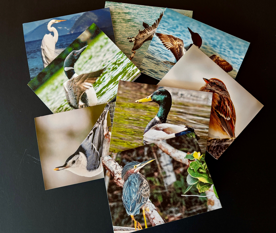 Beautiful photos of birds on blank notecards by Nancy Fowler. These will come with 8 postage stamps.