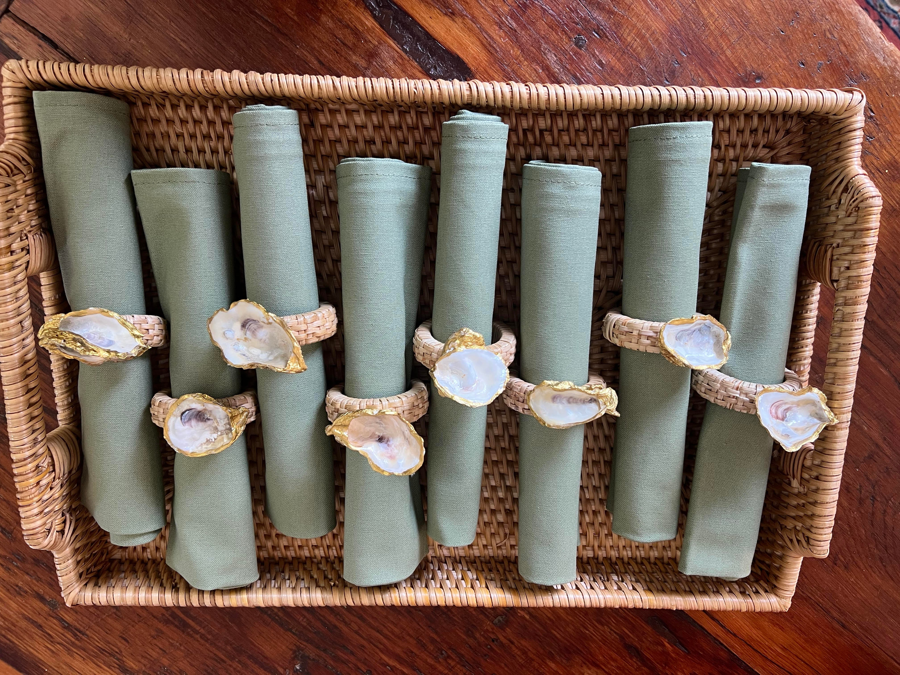 Add coastal charm to your table with this beautiful set of 8 oyster napkin rings and napkins. Each ring features a real oyster shell—hand-selected from Cobb Island—with a shimmering, gilded edge and natural, one-of-a-kind character. Paired with coordinating cloth napkins, this set is perfect for entertaining, oyster roasts, holiday dinners, or any gathering where you want a touch of Eastern Shore style.