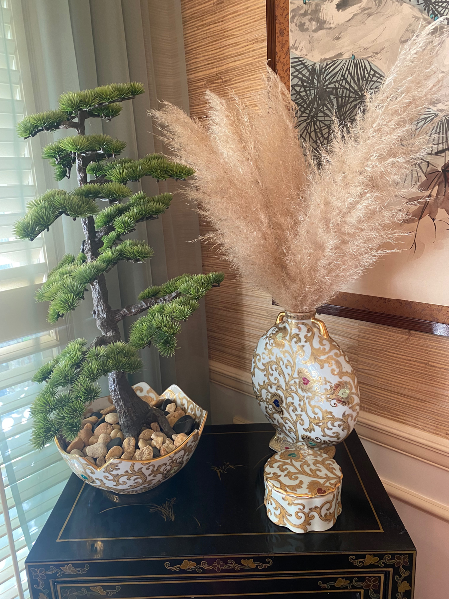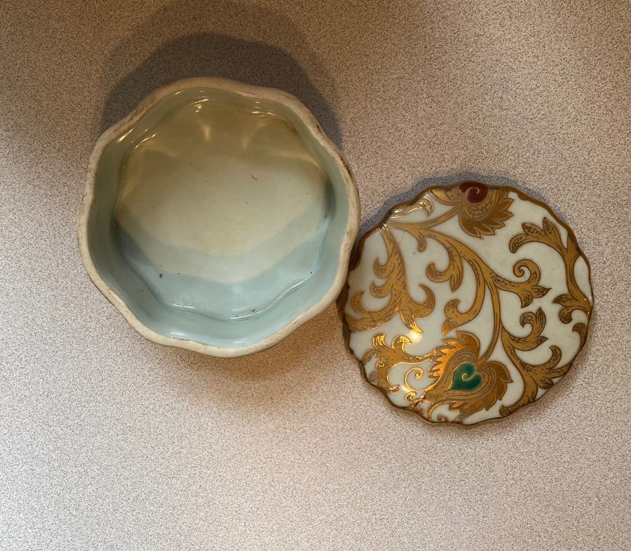 This exquisite three-piece porcelain collection features intricate raised gold scrollwork and colorful jewel-tone enamel accents. The set includes a large decorative bowl, a round handled vase, and a scalloped lidded dish — each showcasing elegant craftsmanship and ornate detail. Each piece bears the Qianlong mark on the base, reflecting a style inspired by the refined artistry of China’s Qing Dynasty. The lustrous gold embellishments and rich design make this a striking display set for any collector or home with a taste for fine Asian-inspired décor.