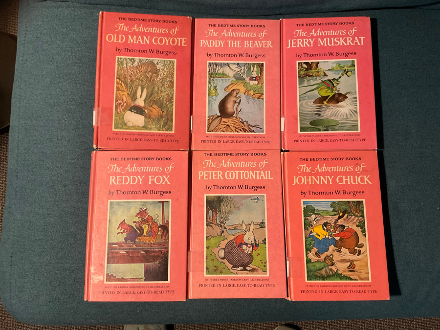 An incomplete set of Thornton W. Burgess’ “The Bedtime Story Books” series. The books included are, “Paddy the Beaver”, “Old Man Coyote”, “Jerry Musrkat”, “Johnny Chuck”, and “Reddy Fox”. Books 10, 8, 5, 6, 11, and 14 respectively.